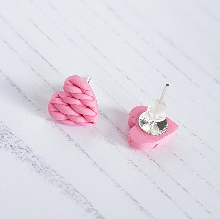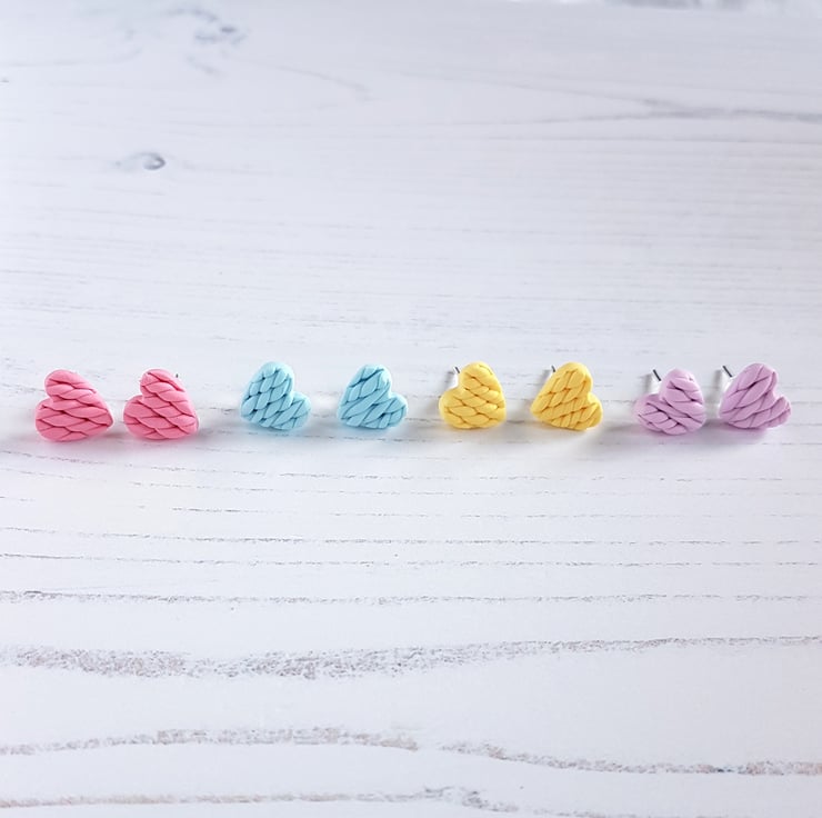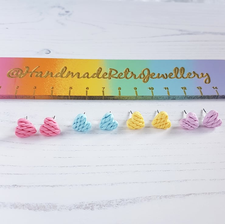 These mini winter knitted heart stud earrings have been carefully hand crafted using polymer clay, hand 'knitted' to create the knit effect. Cut into mini hearts, these are just too cute!