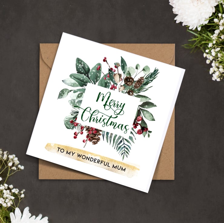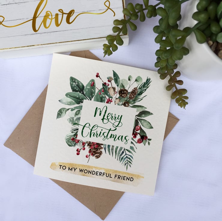 Personalised Merry CHRISTMAS card foliage wreath, red berries pine cones festive