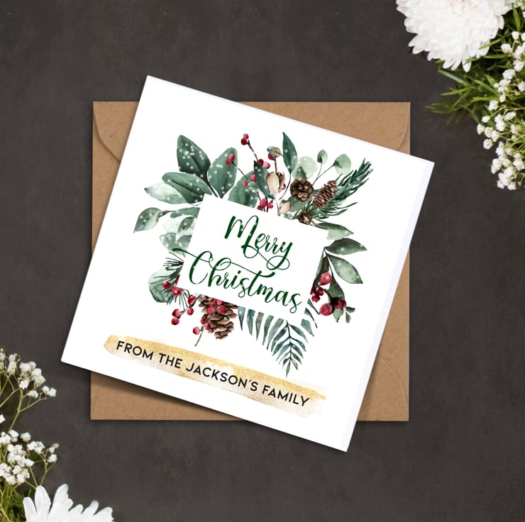 Personalised Merry CHRISTMAS card with green foliage wreath, red berries, pine cones