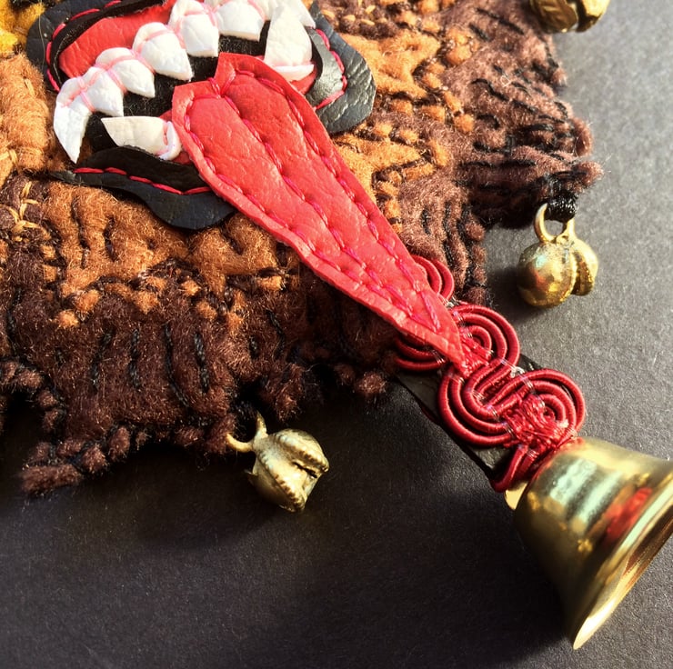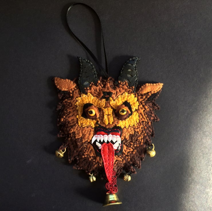 This Krampus decoration made of a number of layers of poly felt, with faux leather details on his tongue and horns, decorative trimming and a variety of bells, some of which I only have a couple left of so again, another almost unique detail, as I can't find any more to buy! PLEASE NOTE, the item you will receive will have 2 sets of bells that ring instead of the 1 set and clam style decoration, as I'm out of those, and wanted more jingle.
