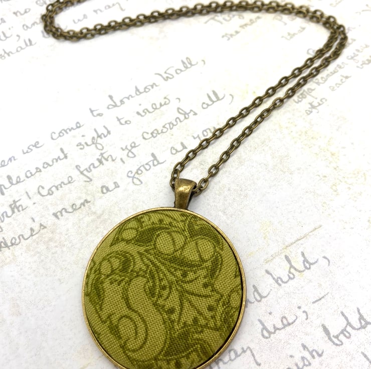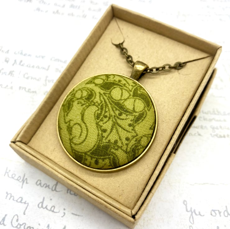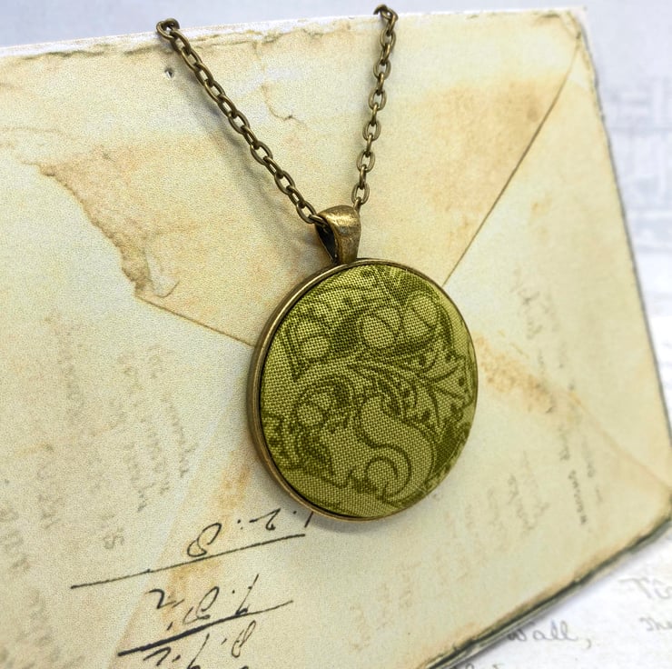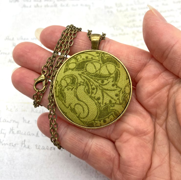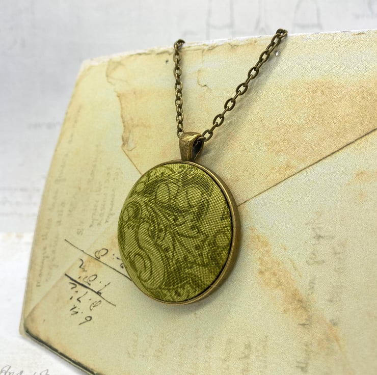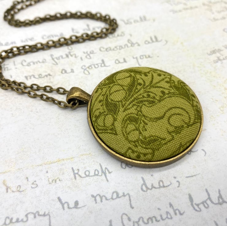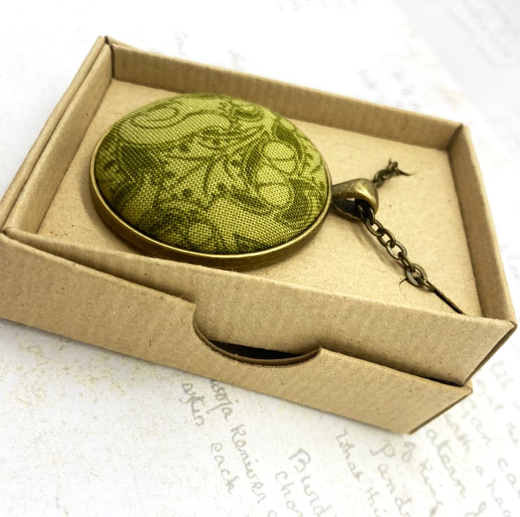 The fabric button itself measures 38mm, but set within the pendant surround measures 4cm wide by 5cm long – this includes the bail. I have added an antique bronze plated 18 inch (45 cm) flat oval trace chain, the links of the chain measure 4.5 x 3 mm and there’s a 12mm lobster clasp at one end. The chain and pendant blank are both nickel and lead free. You do have the option of a longer chain: 20, 22 or 24 inches.