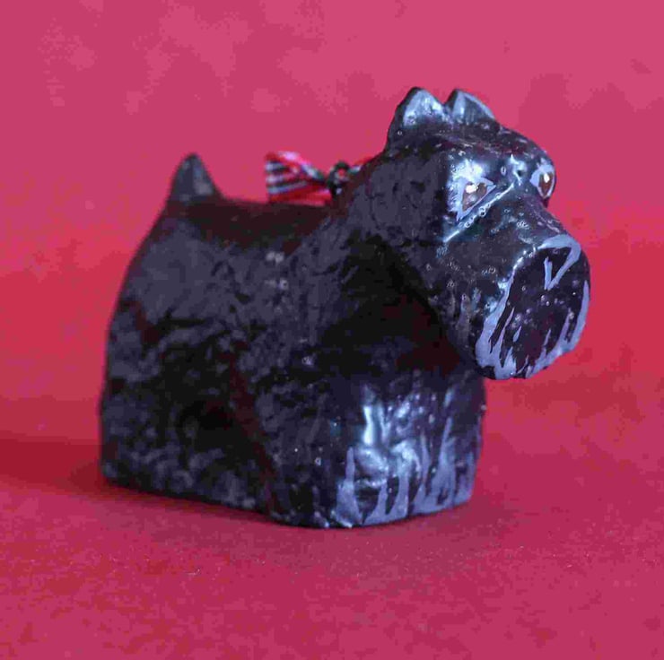 This little scotty dog hanging decoration, is the ideal stocking filler for dog lovers. He's made from recycled newspaper and measures 7.5cm x 3cm x 6cm. He has a smart tartan ribbon to hang him on your tree. Because of the nature of the material and the hand painting, each one is slightly different from the picture but they are all cute.