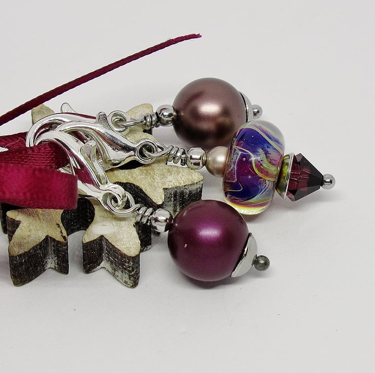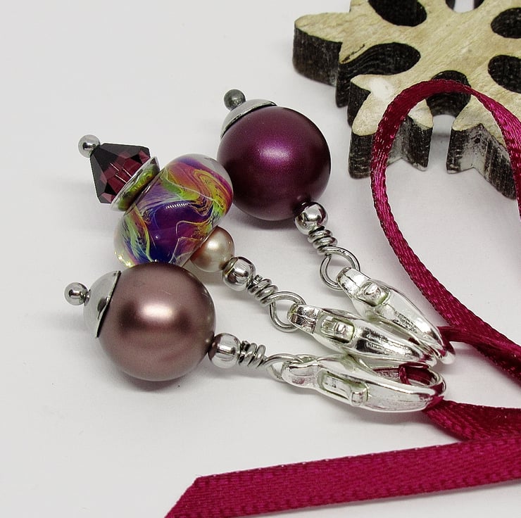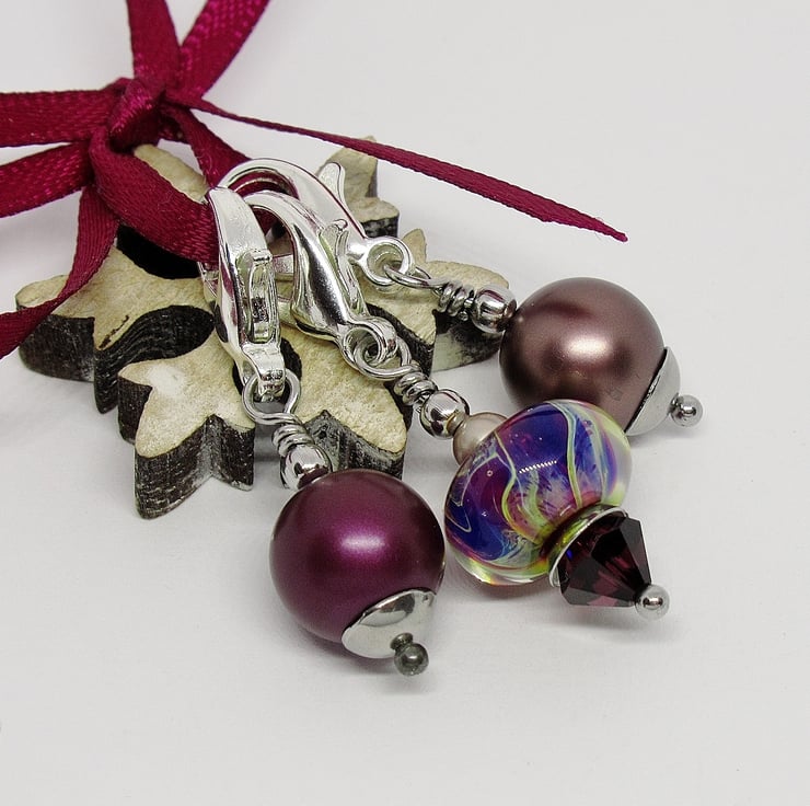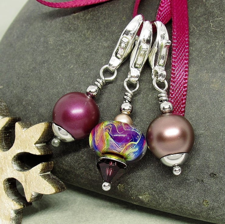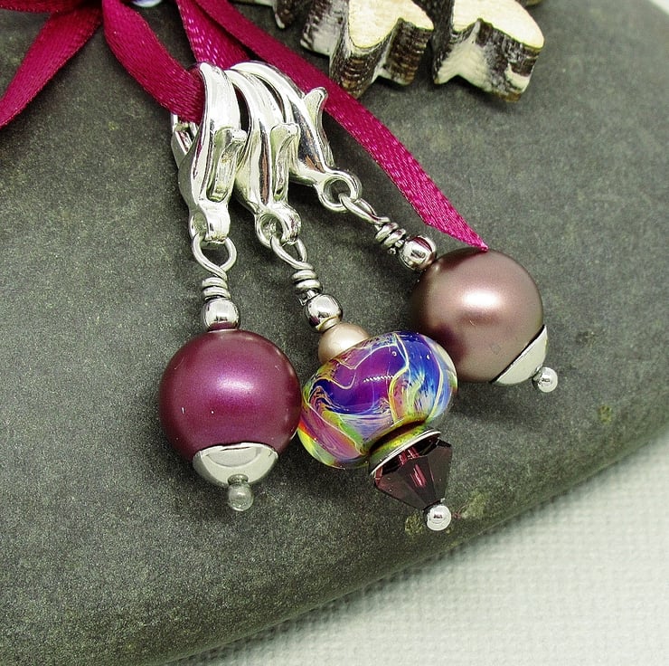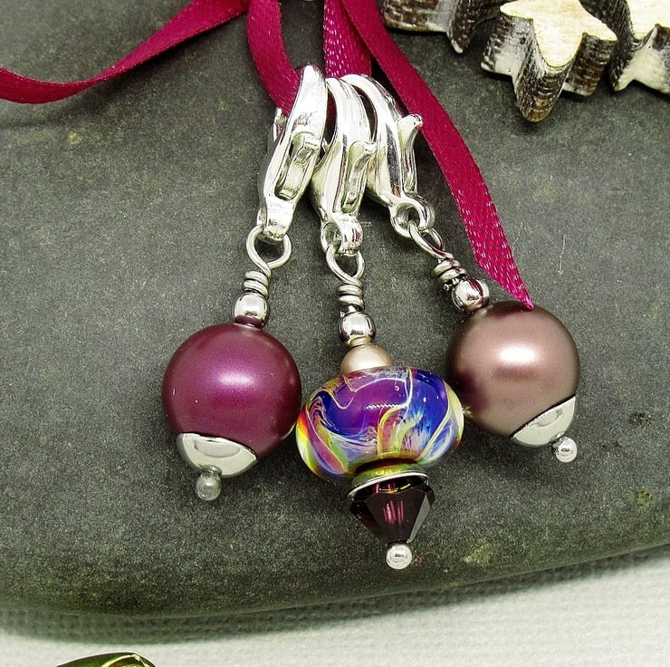 A gorgeous plum lampwork bead is the focal of this trio of stitch markers. This lovely lampwork bead has been made using reflective silvered glass and shows lovely plum shades which remind me of mulled wine. I have complimented it with Swarovski crystal pearls in chocolate brown and burgundy red in keeping with the festive theme. A perfect gift for crafters to help keep track of stitches and rows.