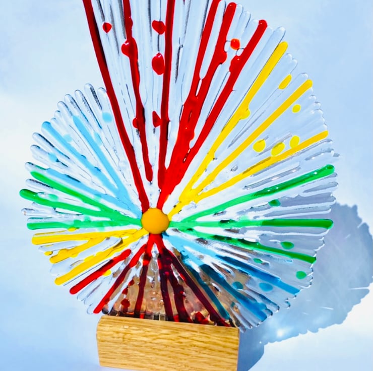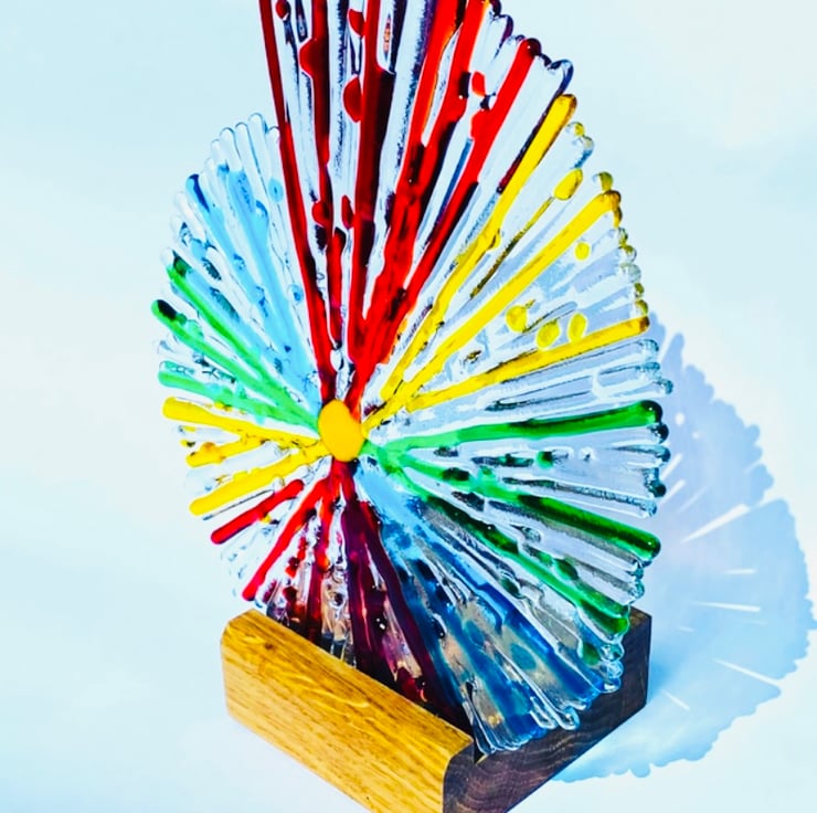 Stunning glass ammonite freestanding sculpture made my using fused glass and kiln forming -all handmade by me in my Devon home studio. Many slim strips are cut, measured and assembled to create with wonderful textured piece which stands in an oak base . The oak base also has a candle recess that can backlit at night to add evening interest to your piece. Stunning transparent rainbow colours in this one give it a bright contemporary feel. Perfect gift , the glass slots in and out of the base for ease of cleaning and transporting.
