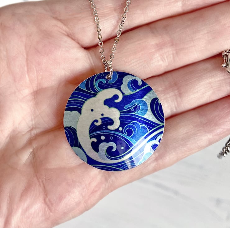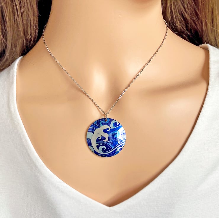 Ocean blue surf necklace, 32mm disc pendant, handmade jewellery. (593)