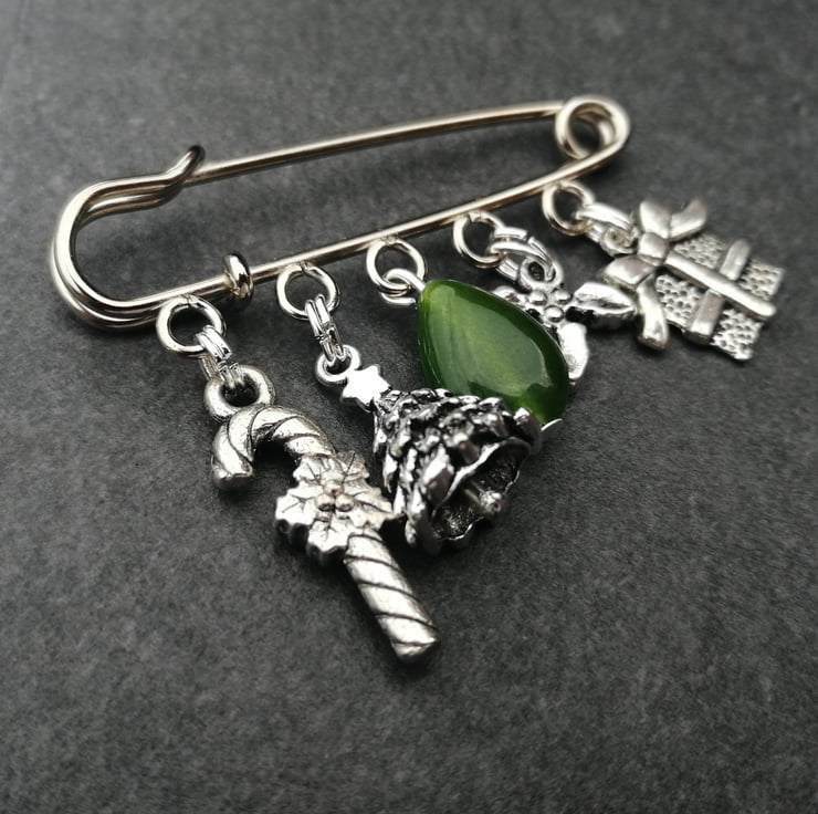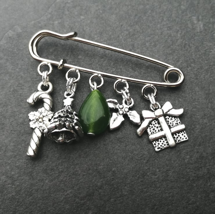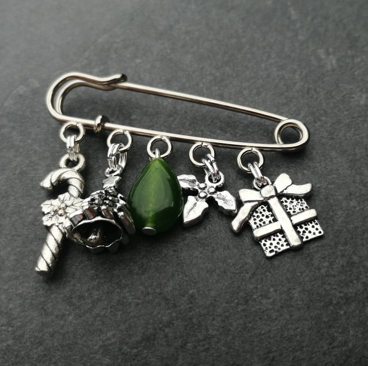 This pretty, Christmas pin is made with a stainless steel kilt pin. Silver plated charms and a jade drop. It would look wonderful on a coat or a bag.