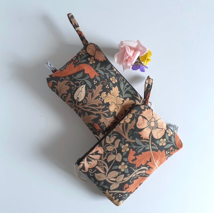 This practical little make up bag could also store small amounts of toiletries for a weekend away. Upcycled from a vintage Morris and Co curtain fabric, it has the feel of faded country house glamour. Compton was designed by Morris and Co and later printed by Sanderson with this beautiful print of rust leaves and peach tendrils. Classic autumn colours. It would make a great present for a lover of vintage William Morris textiles, for anyone going away to Uni, or as a present for Mum.