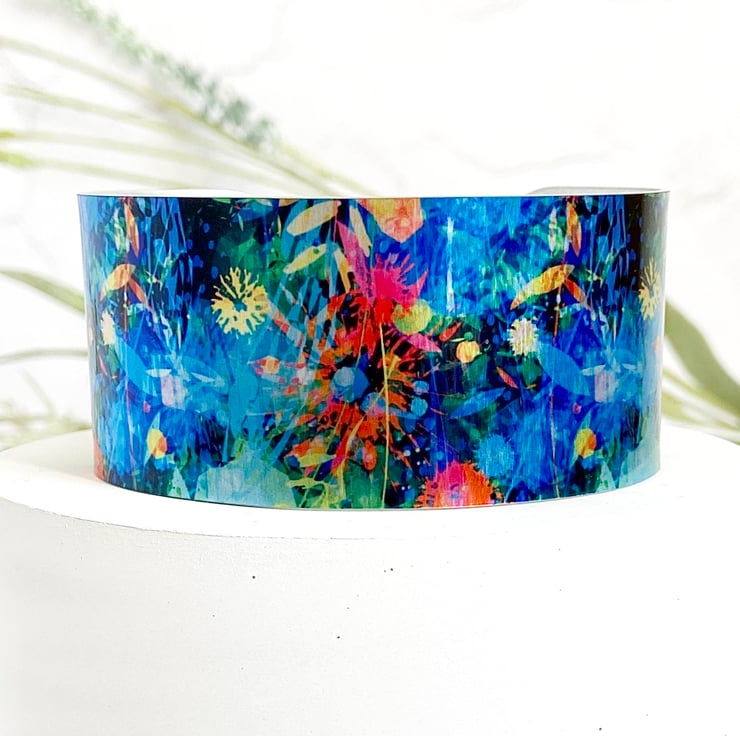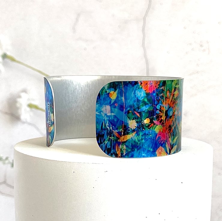 I've handmade this bracelet from aluminium with an abstract floral design. Matching earrings and pendant available. In addition, for a small fee, a personalised message can be engraved on the reverse (Optional).