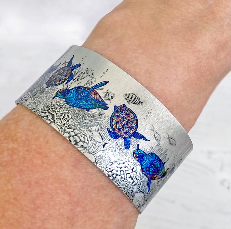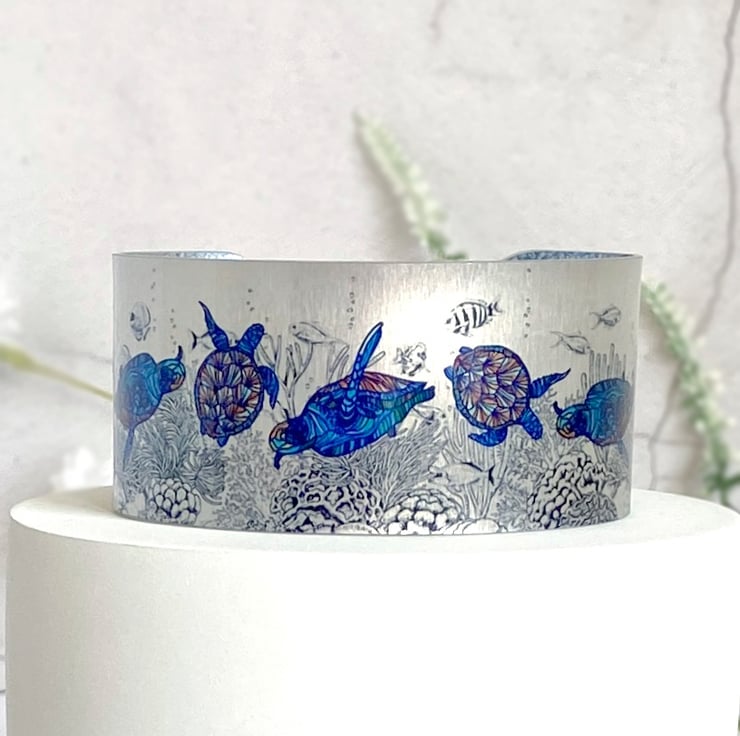 I've handmade this bracelet from aluminium with a swimming turtles design. An ideal gift for someone who loves sea life. In addition, for a small fee, a personal message can be engraved on the reverse (Optional).