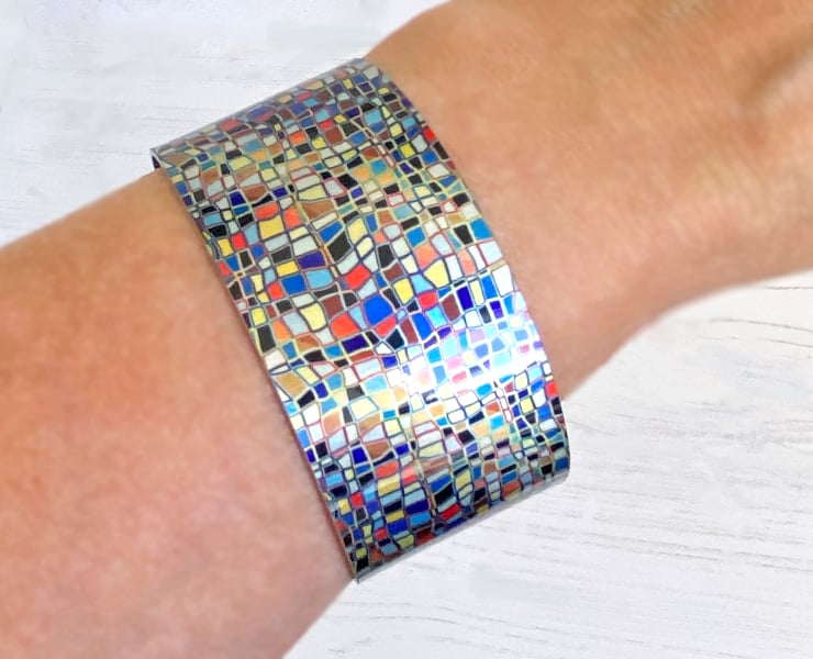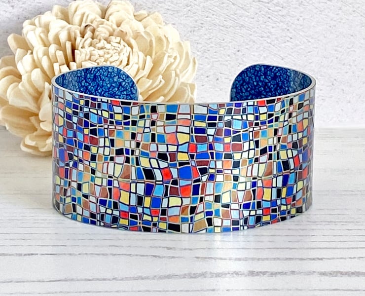 I've handmade this bracelet from aluminium with a geometric mosaic design. Matching earrings and pendant available. In addition, for a small fee, a personalised message can be engraved on the reverse (Optional).