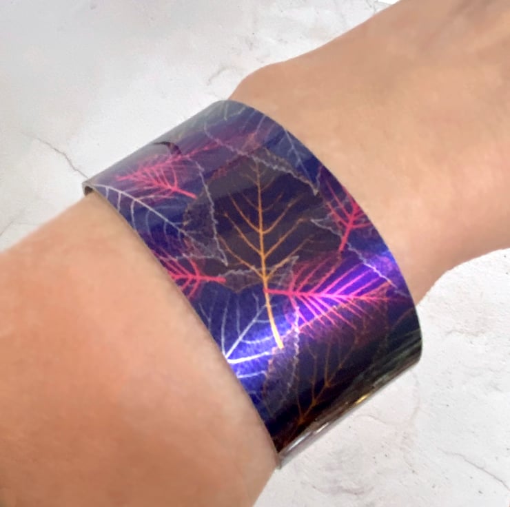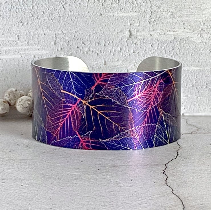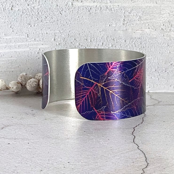 I've handmade this bracelet from aluminium with an overlaid leaf design in purple blue colours. Matching earrings and pendant available. In addition, for a small fee, a personal message can be engraved on the reverse (Optional).