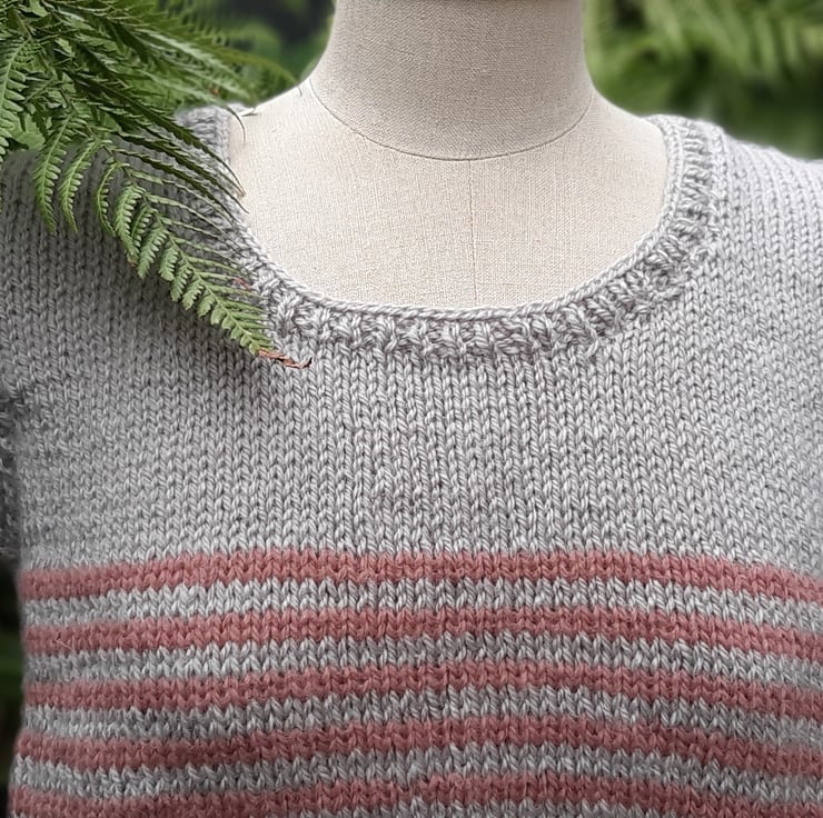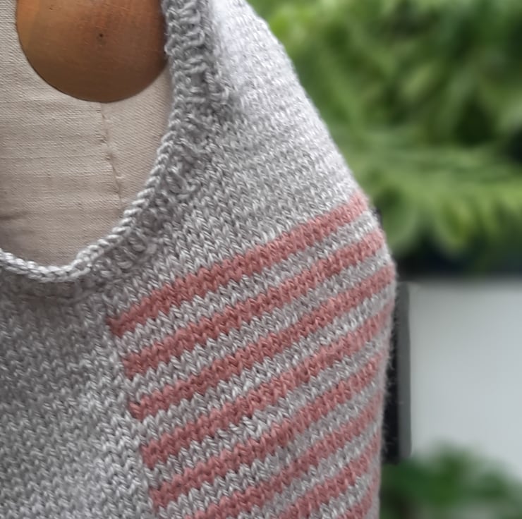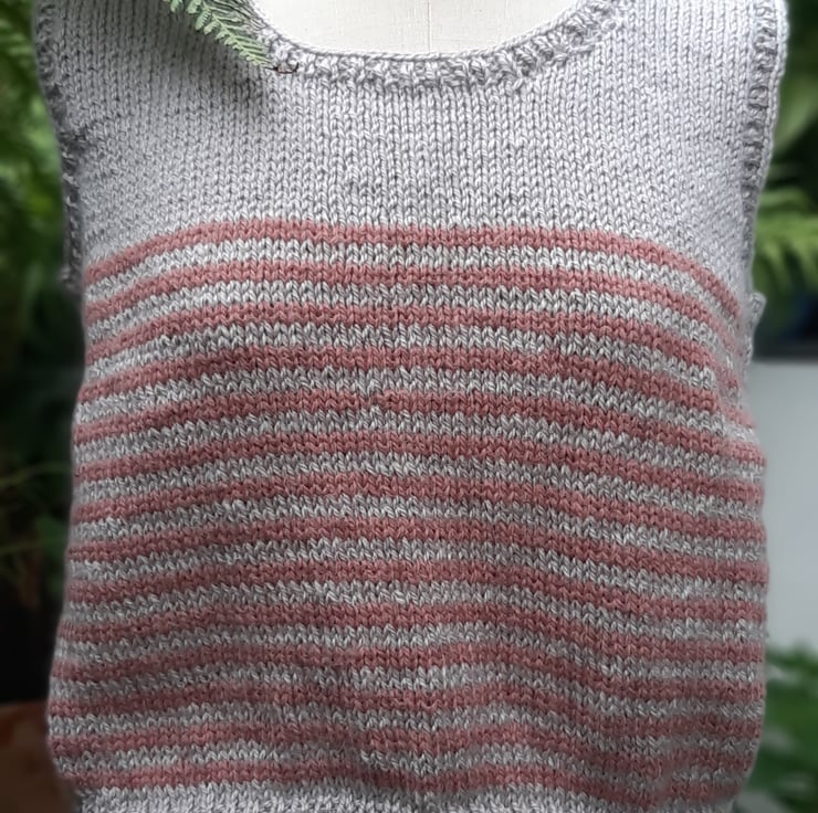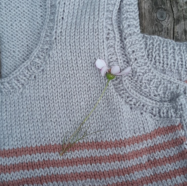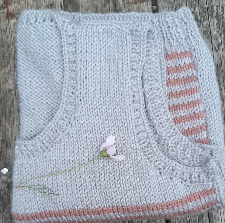 Very soft colours and a wool and acrylic mix of wool so easyer to wash .beautifully knitted by hand . Medium size or a snug fit on a larger person. 50 cm across 54 cm from nape of neck to the rib bottom .