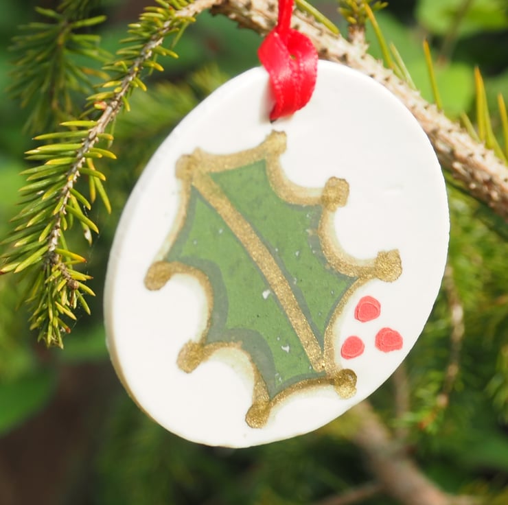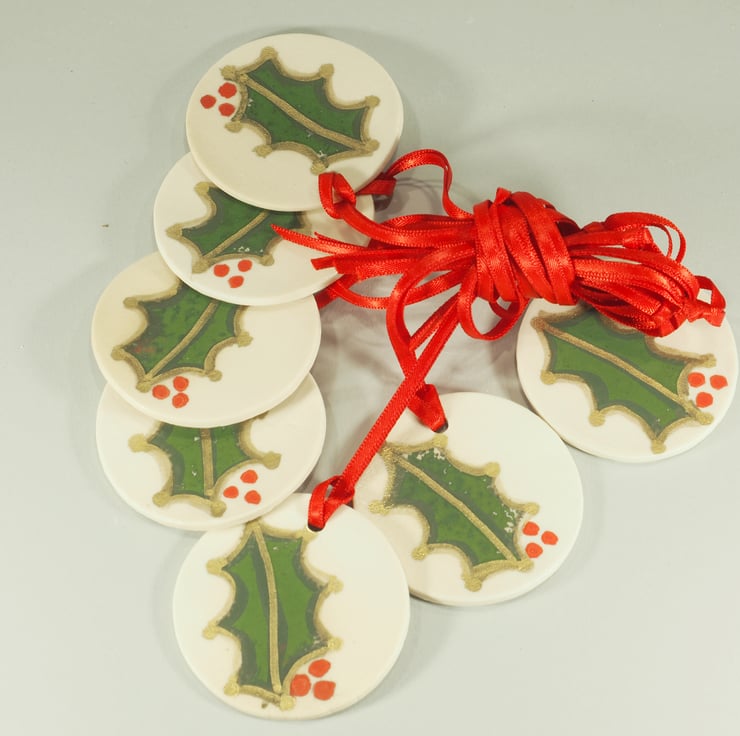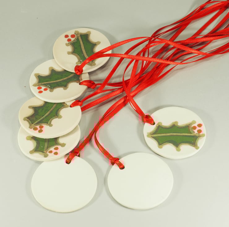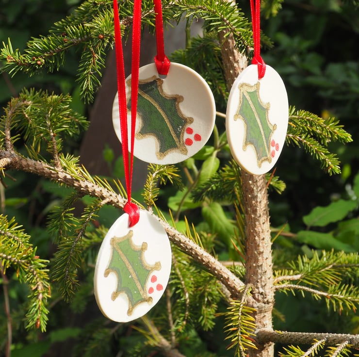 Set of 5 porcelain hanging decorations on a long ribbon. Each disc has been cut by hand and hand painted with a holly leaf and berries, before firing in the kiln. Supplied with a long red ribbon (20cm loop) which you can adjust to suit your tree if needed.
