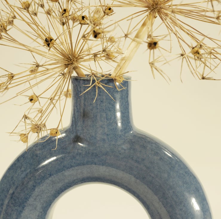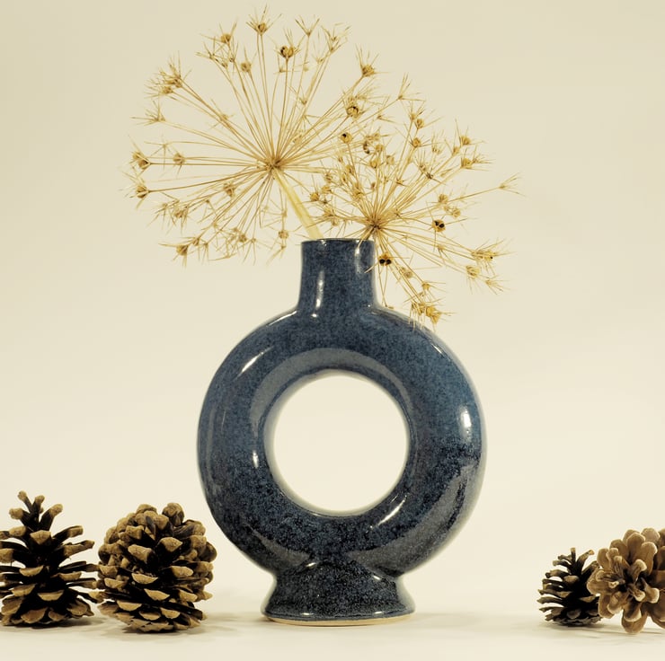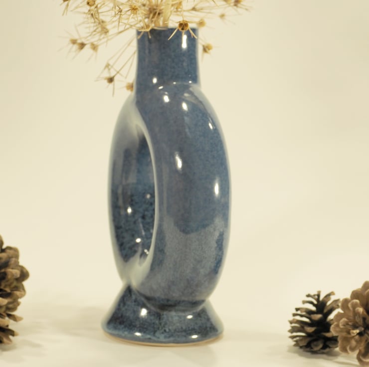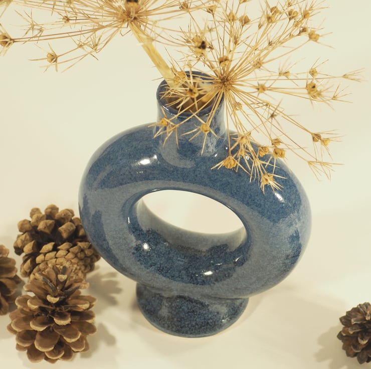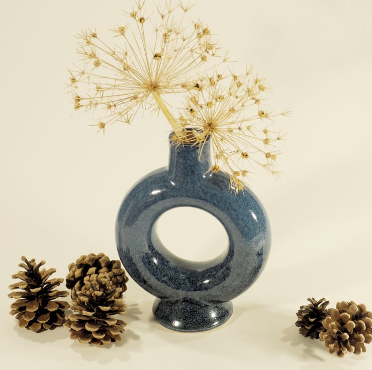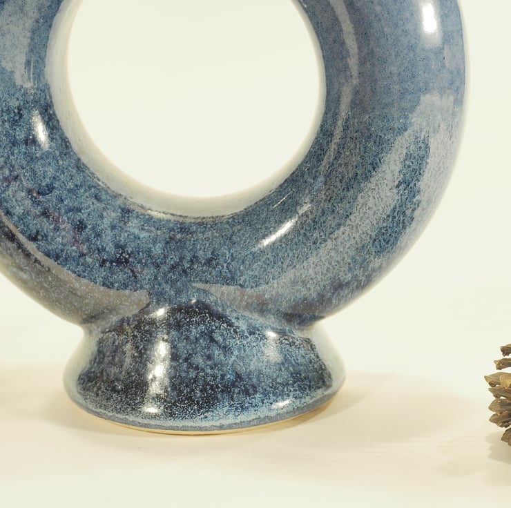 An unusual blue vase which is ring, or torus shaped. It was thrown on the potters wheel in three separate pieces and then assembled at the leather hard stage before firing, glazing and then firing again to 1235deg C. The entire ring is able to hold water.