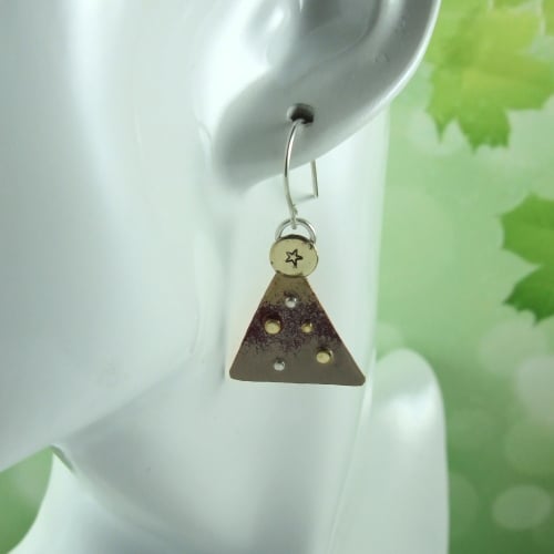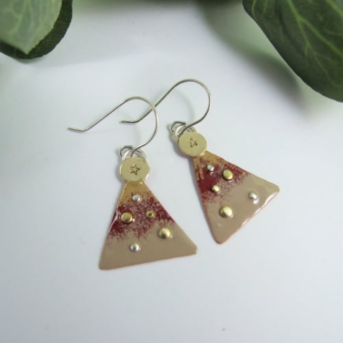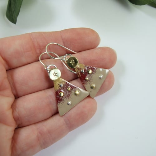 I have cut the base triangle from copper sheet then added a silver and brass bail with a hand stamped star. The tree has been given 3 different coloured layers of low temperature Efcolour enamels which are fired in a regular oven, they start out as a very fine powder which becomes liquid as it heats and sets glossy and embedded tiny silver beads for baubles. Fitted to sterling silver earwires.
