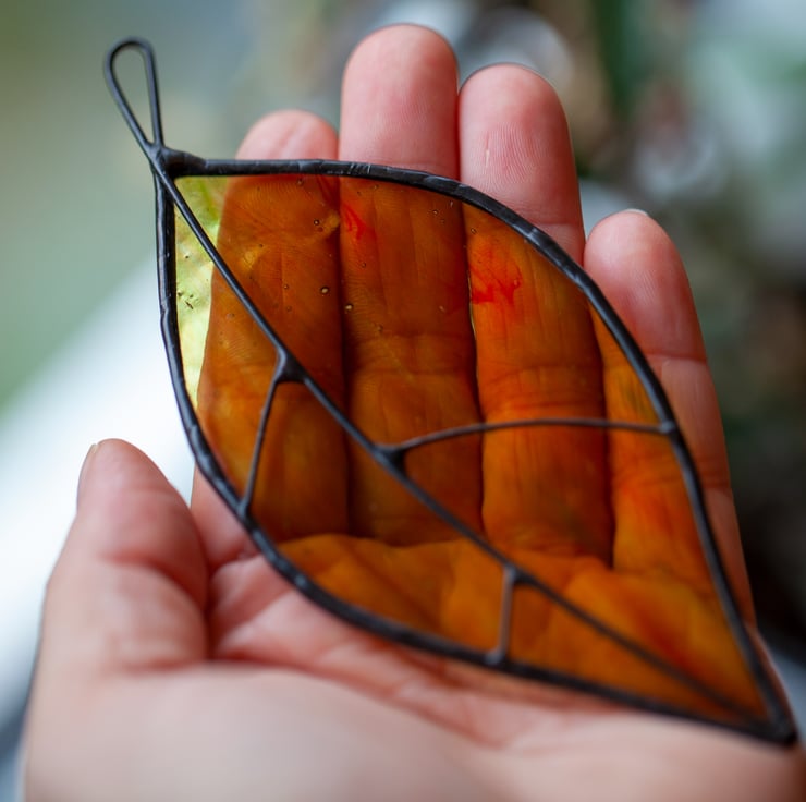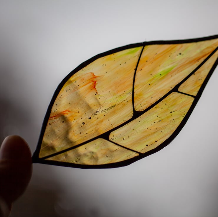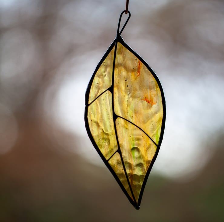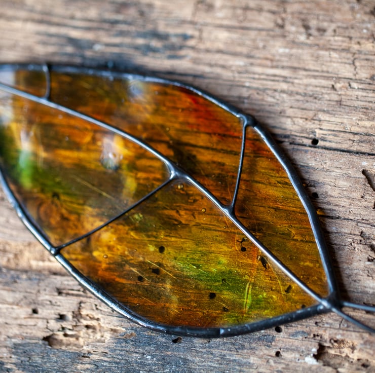 Simple but beautiful stained glass suncatcher. Made of translucent textured glass with added wire veins, finished in black patina. 12x6cm approx.