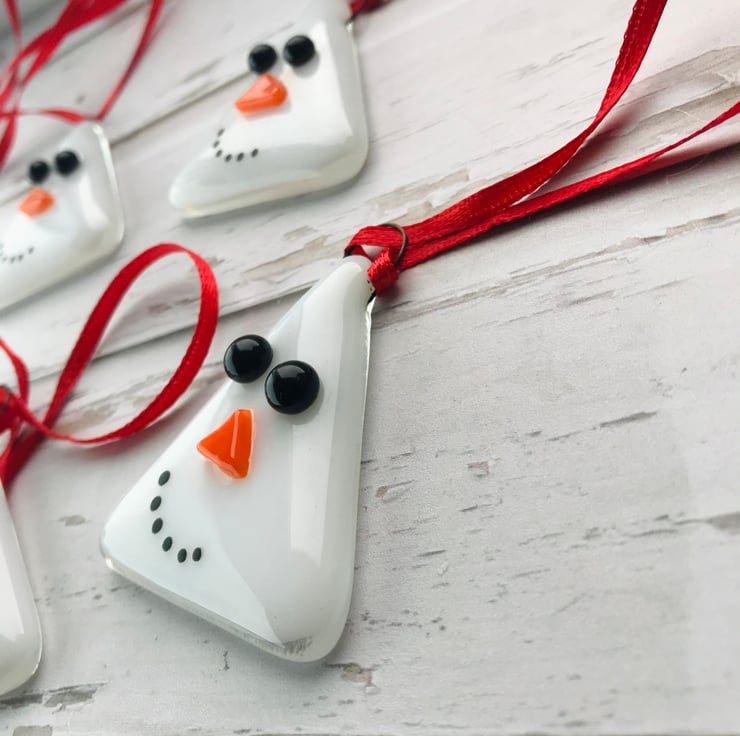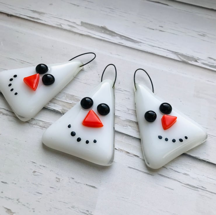 These small but so cute Christmas decorations are made from two layers of hand cut glass which is fully fused before I add the face details, of stones and carrot (or glass) and tack fuse. They measure approx 4 by 5cm.