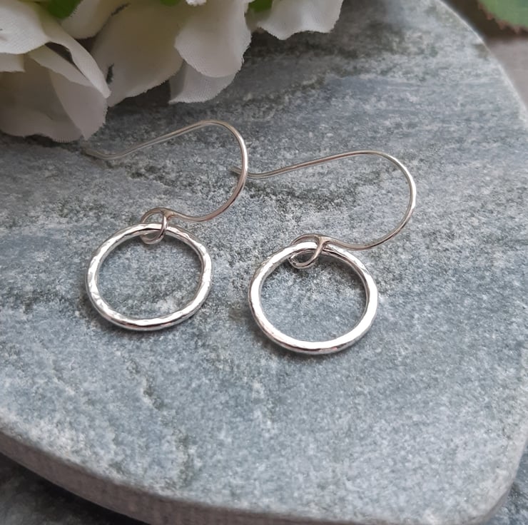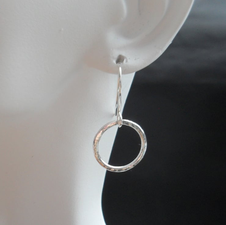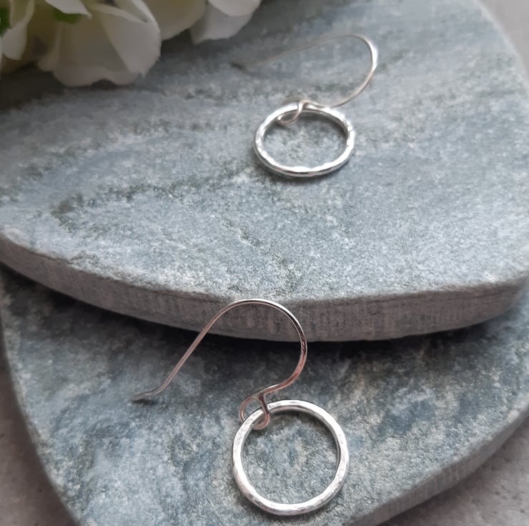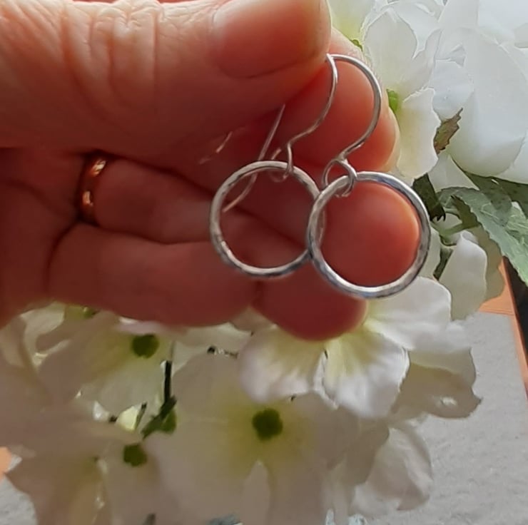 These earrings have been made out of sterling silver wire which has been formed into a circle soldered and hammered to give texture and harden the wire .The silver hoops have then been attached to handmade sterling silver ear wires