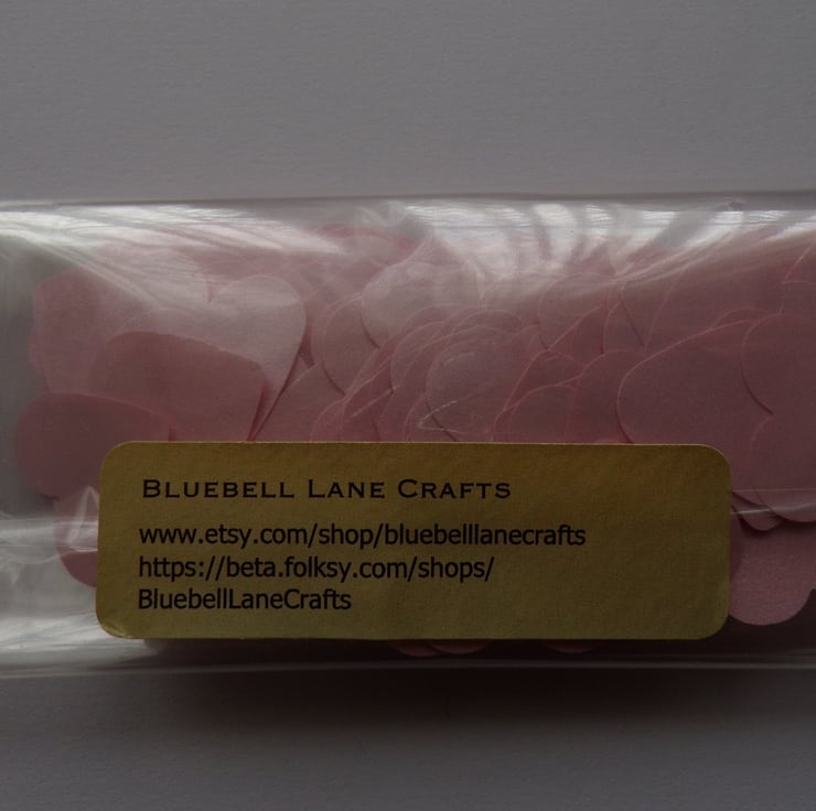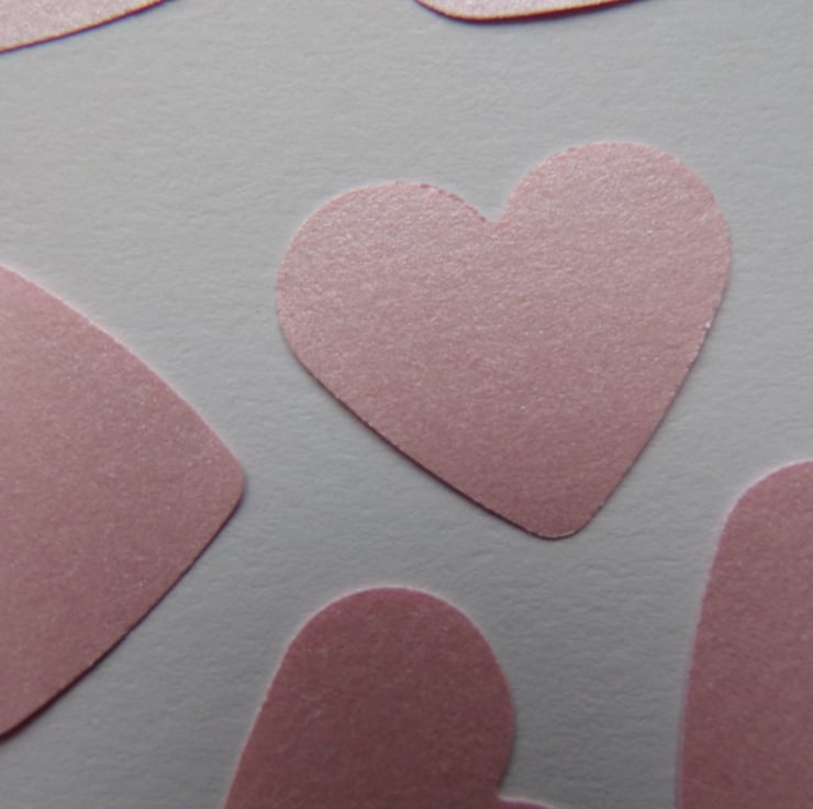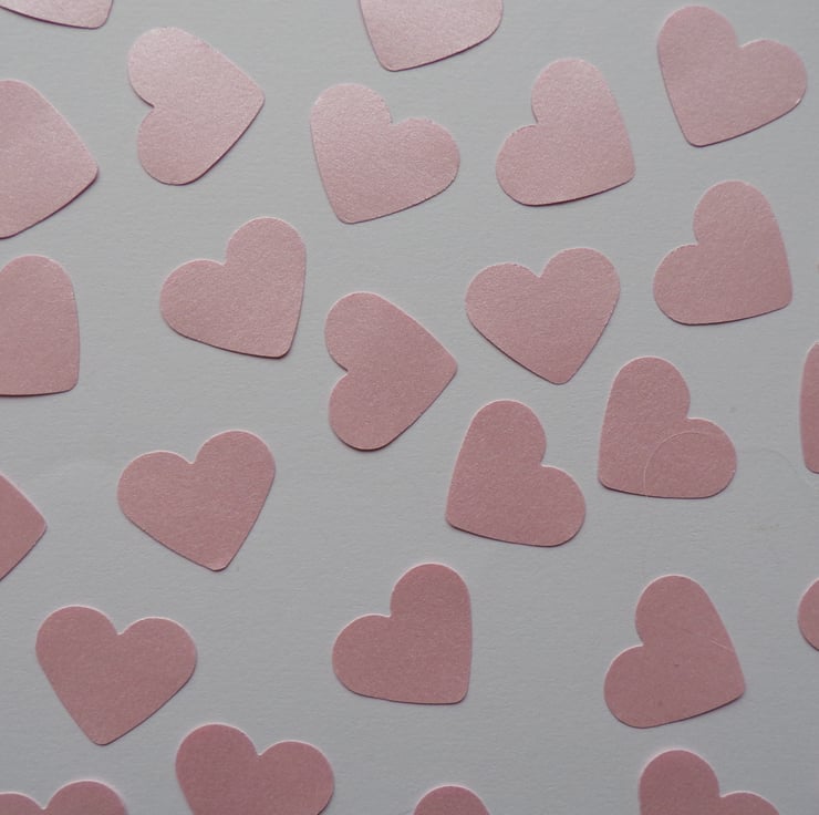 A pack of 200, pink pearlescent shimmer double sided hearts measuring 2.5cm on quality cardstock.