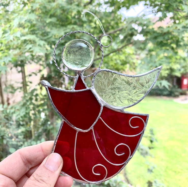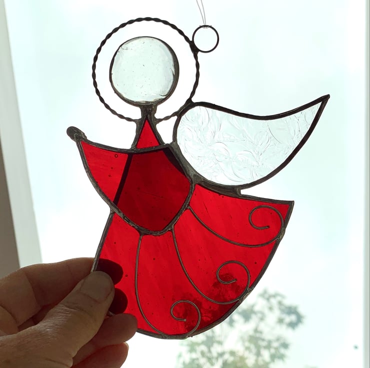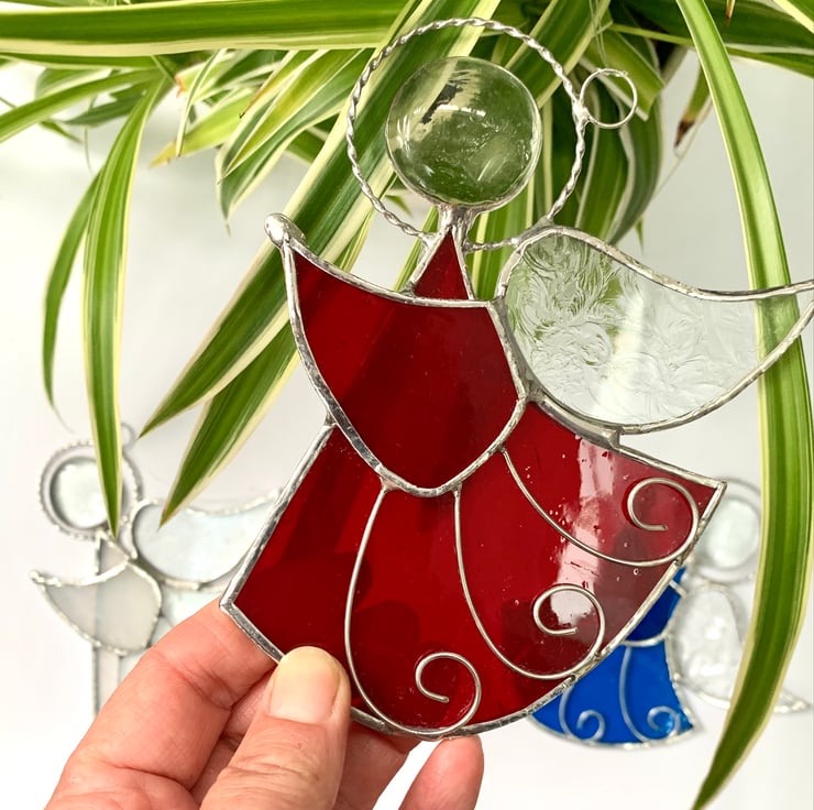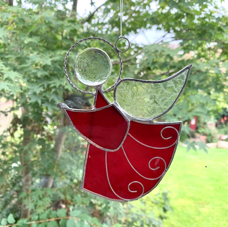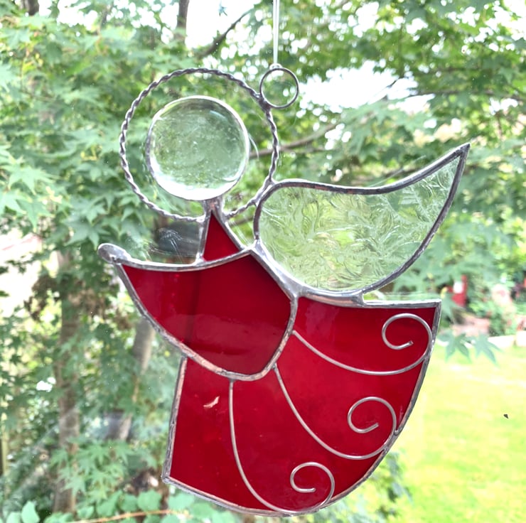 The glass used for the Angel is a lovely deep red sea glass for the skirt and glue chip glass for the wing. A large glass nugget used for the head and tinned wire for the halo and skirt decoration.