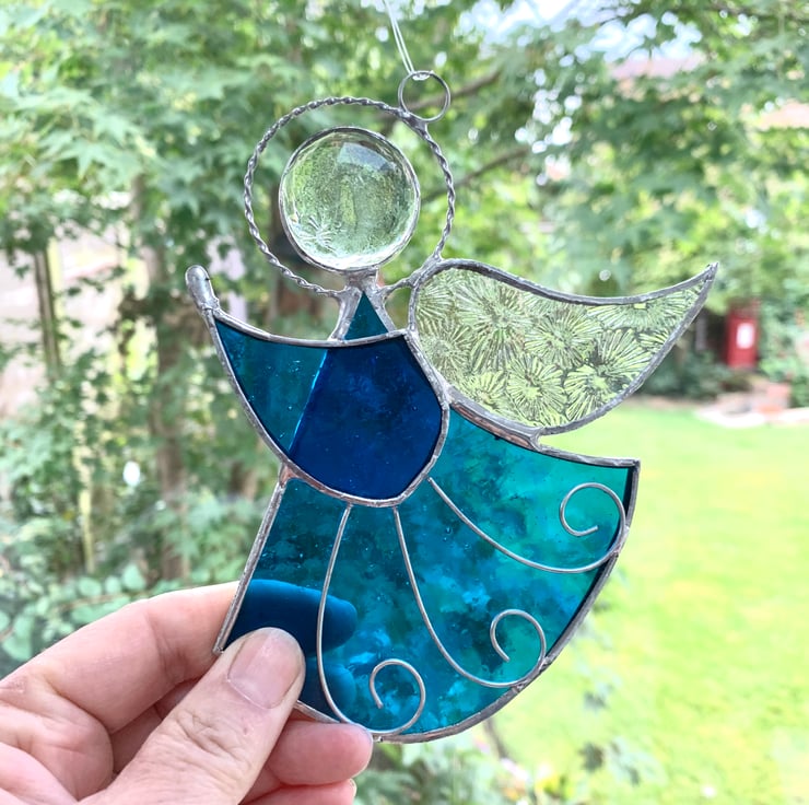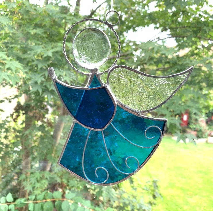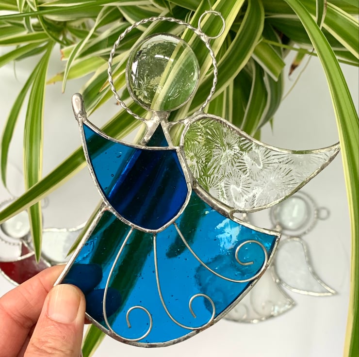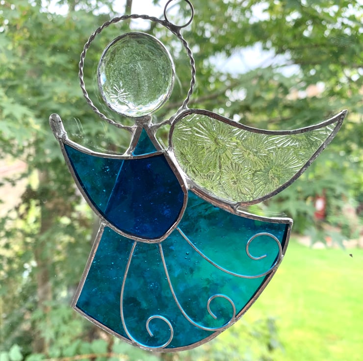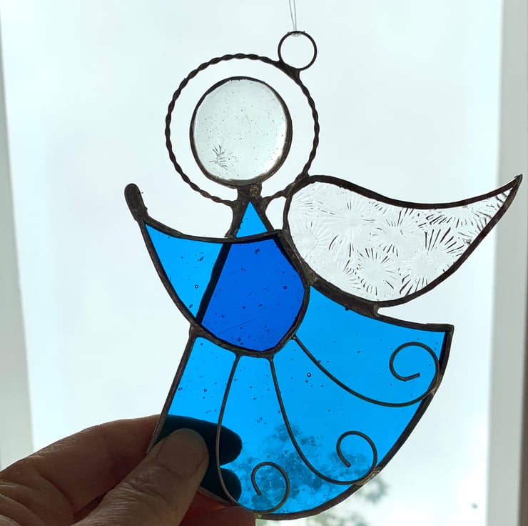 The glass used for the Angel is a lovely petrol blue sea glass for the skirt (one of my favourite colours) and glue chip glass for the wing. A large glass nugget used for the head and tinned wire for the halo and skirt decoration.