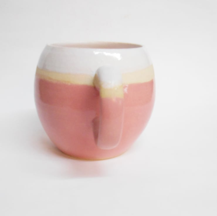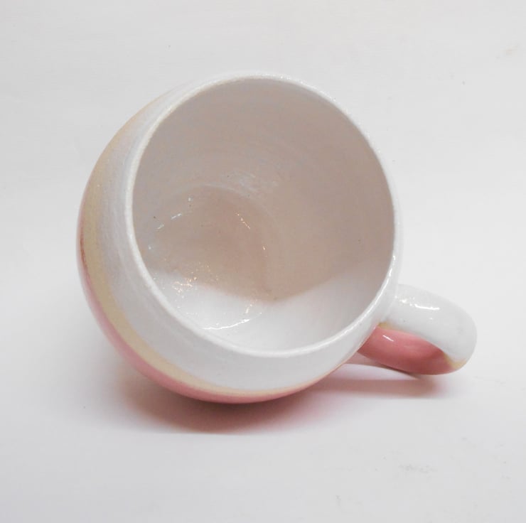 It has been hand painted with shiny tin white glaze on the interior, and hand painted with a Shiny Dusky Pink glaze band on the lower portion of the mug.