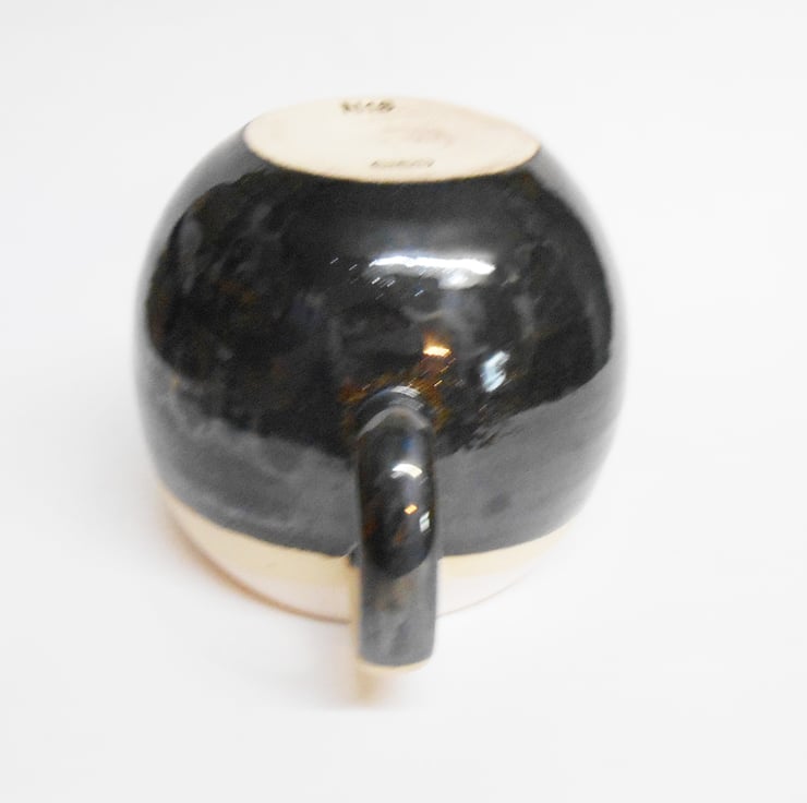 It has been hand painted with shiny tin white glaze on the interior, and hand painted with a Shiny Mirror Black glaze band on the lower portion of the mug.