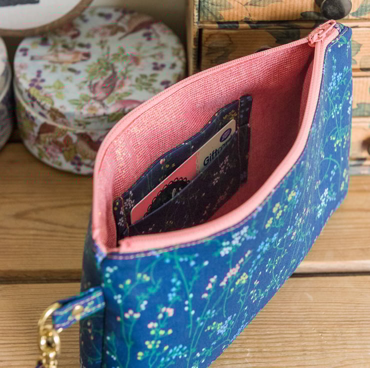 I've interfaced the lawn with 2 layers of woven cotton to give it structure and strength and added a soft fleece to protect the contents. The lining of the purse is also interfaced with woven cotton to ensure longevity and add more structure to the bag overall. I've added a 2 slot panel on one side of the lining, which is perfect for carrying a few credit cards and a fabric loop to attach your keyring to.