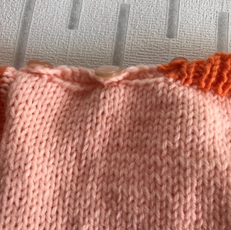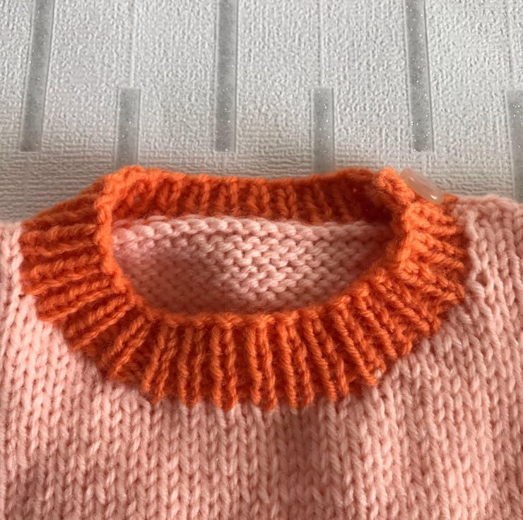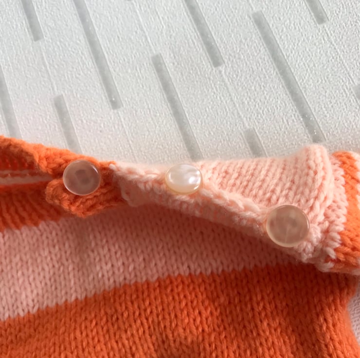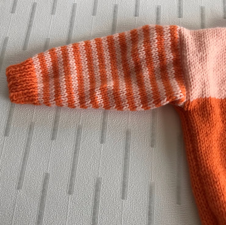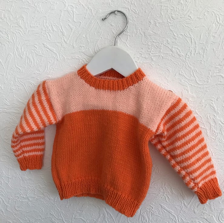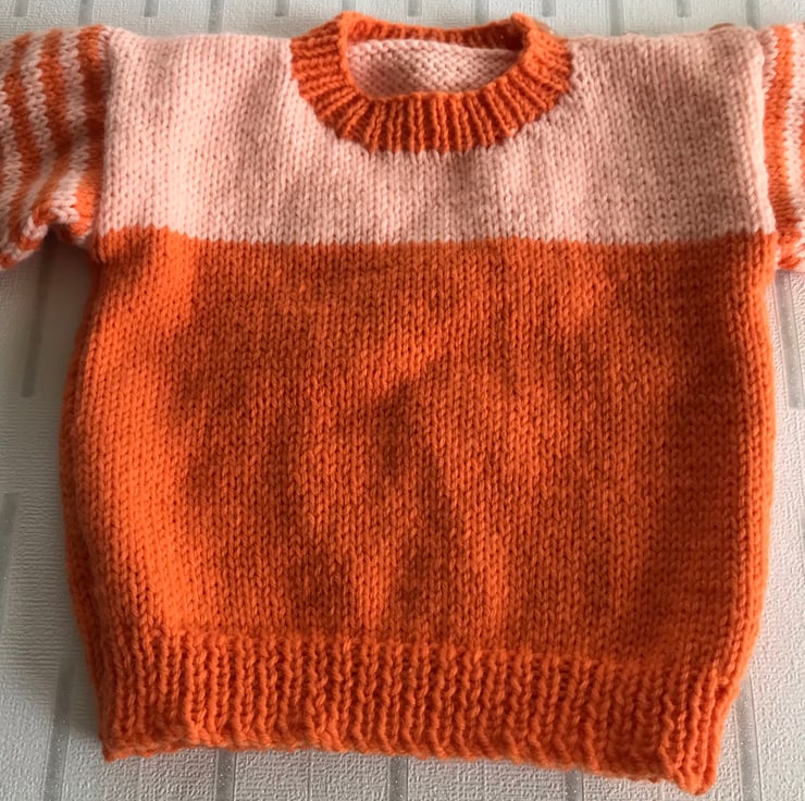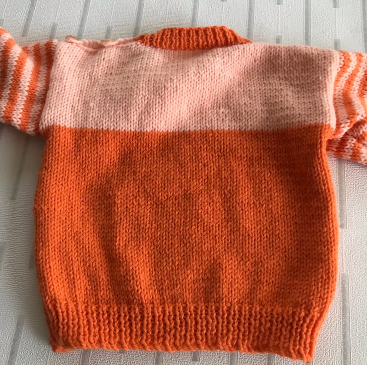 This jumper is hand knitted in a soft baby yarn. The bottom part of the jumper and the ribs are worked in a pumpkin colour and the top part is worked in peach. The sleeves are striped using the two colours. It has a round neck and fastens on the shoulder with three buttons.