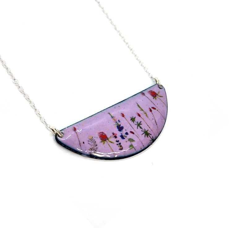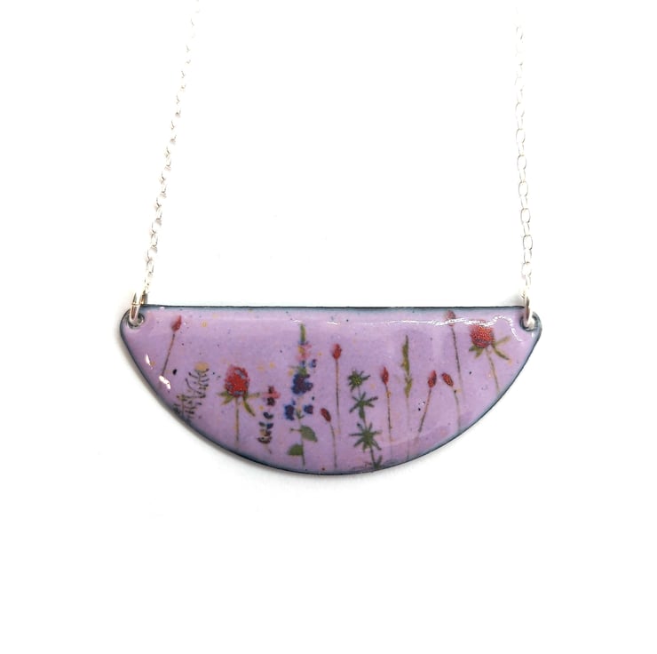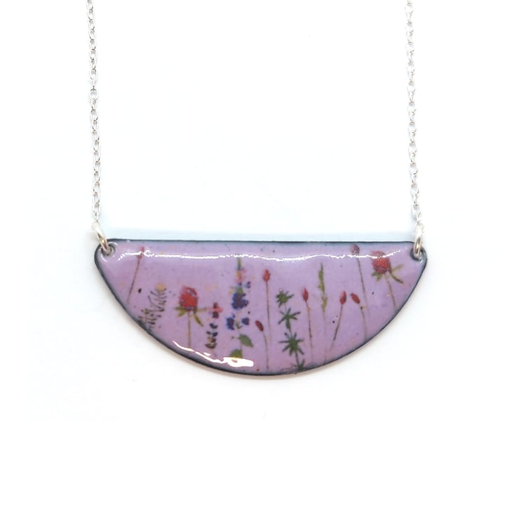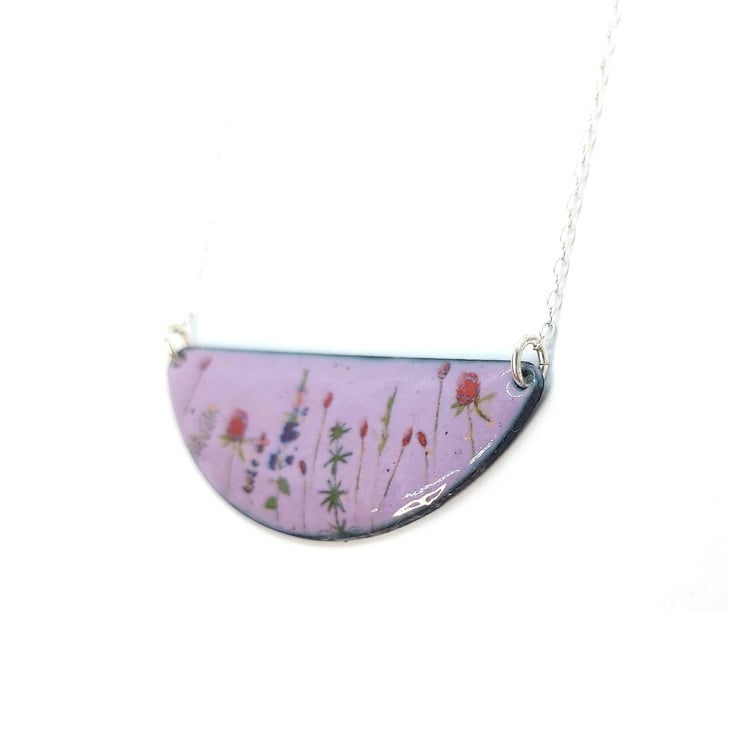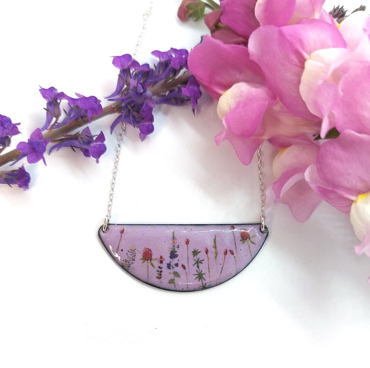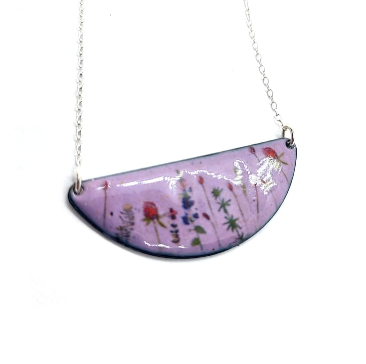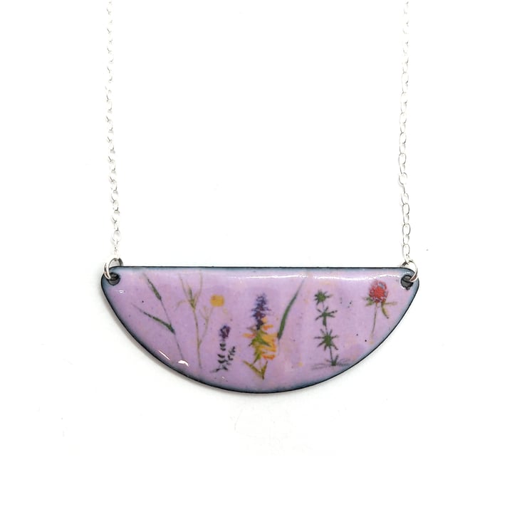 When you are out for a walk, gorgeous wild flowers line the fields and are home to a variety of wildlife. This half-moon shaped necklace has wild flowers dotted on a light purple enamel background.
