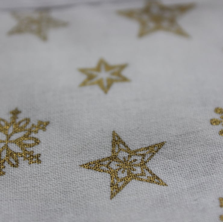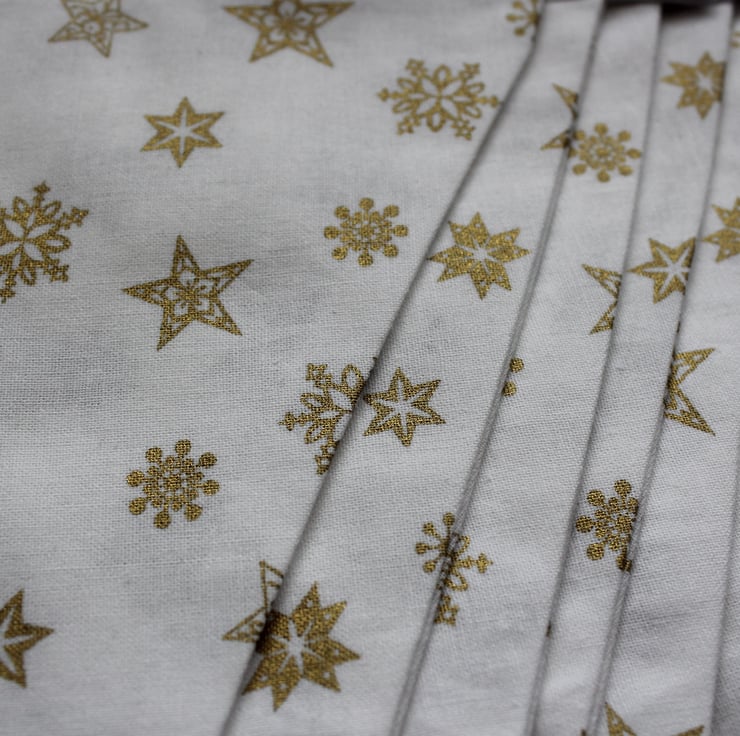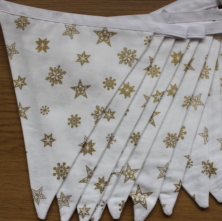 This Christmas bunting features festive gold stars and snowflakes on a white background.