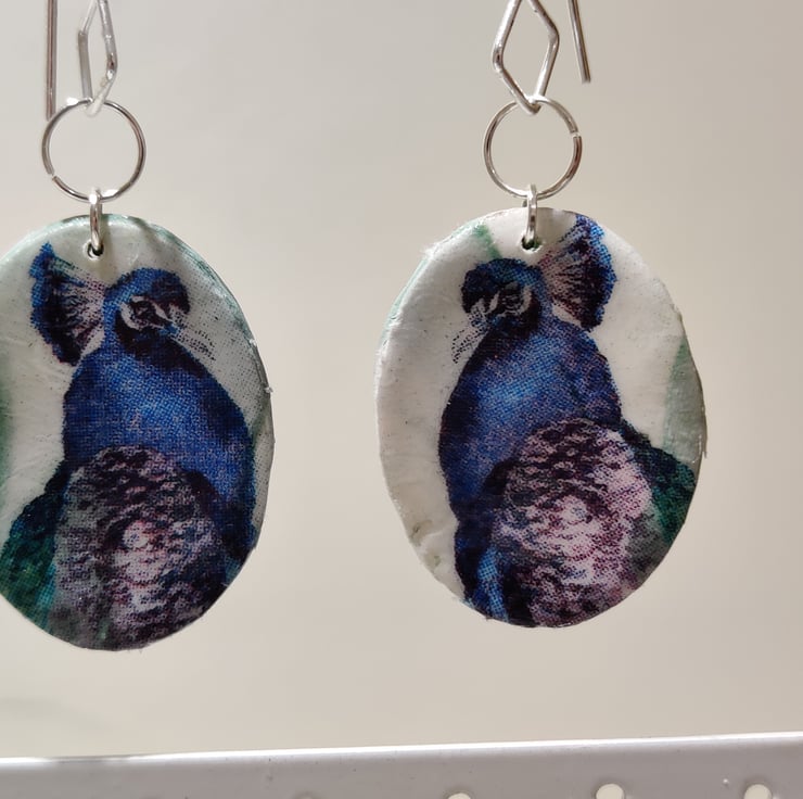 Hand made polymer clay earrings with a peacock designed and silver coloured fixing. Hook fixing which can be painted with hypoallergenic coating on request for free. Please see all photos for close up detail. All products handmade therefore there may be minor imperfections. Each pair sold as seen, message for more