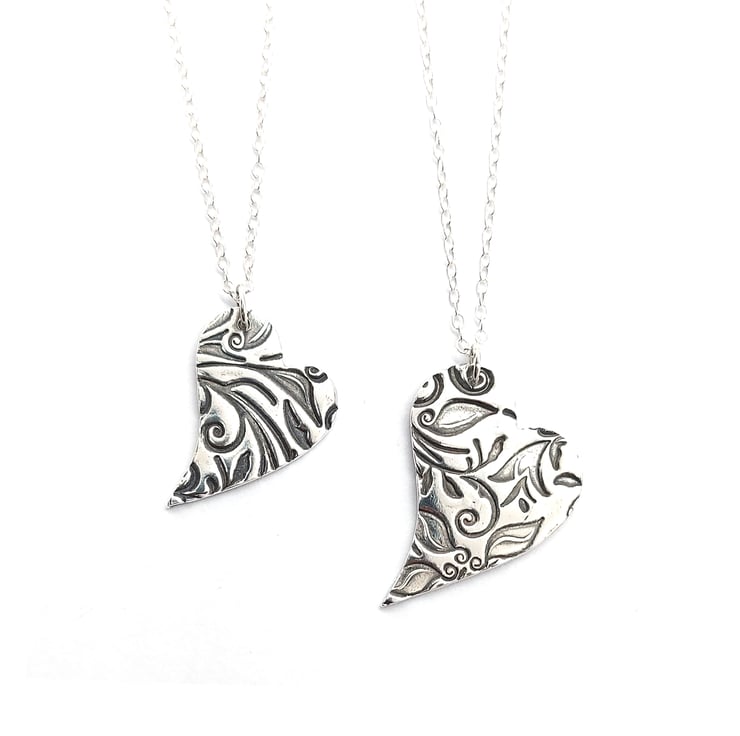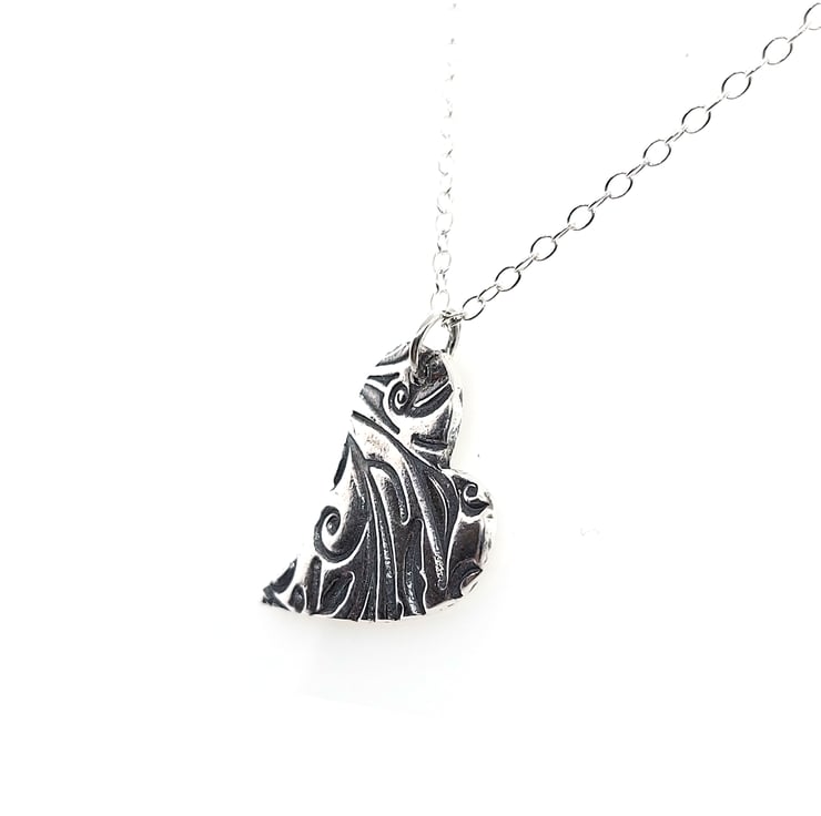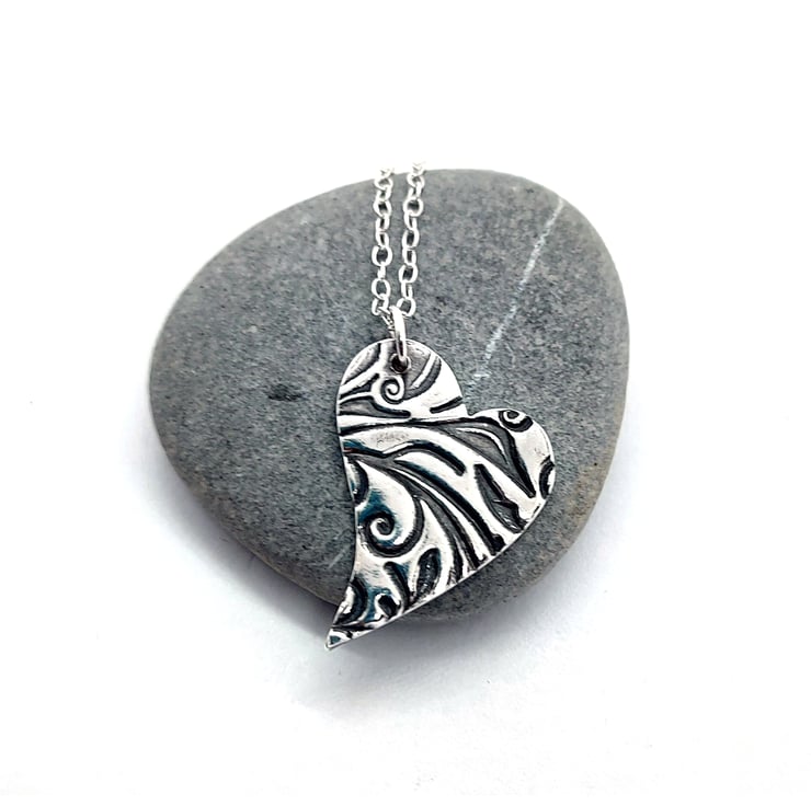 Crafted in solid silver, this stunning asymmetric heart pendant has a pretty floral vine leaf pattern. The pendant has been oxidised to highlight the gorgeous pattern. A perfect gift of devotion for your loved one.