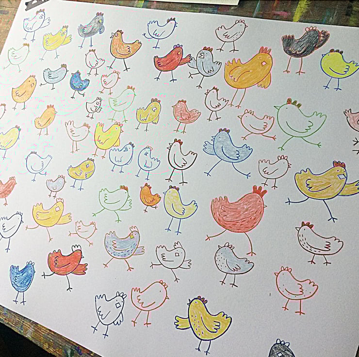 Happy Hens A5 print -velvety matt digital art print with my logo on the back. From an original pencil crayon illustration.Perfect for framing (fits standard frames) sturdy enough to prop on a shelf pin to a board or tape to a home office wall for a little uplift and add colour to your world.