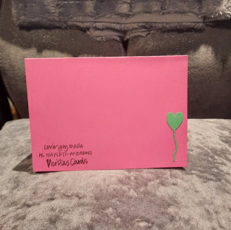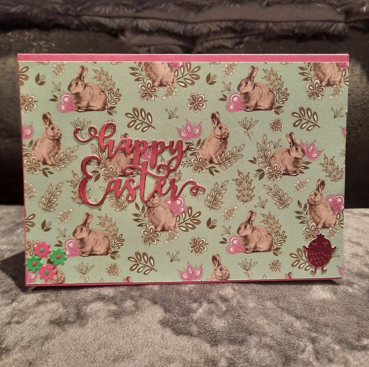 It has a metallic bright pink die cut 'Happy Easter', a wee chick on the right hand bottom edge and a few green/pink flowers bottom left.