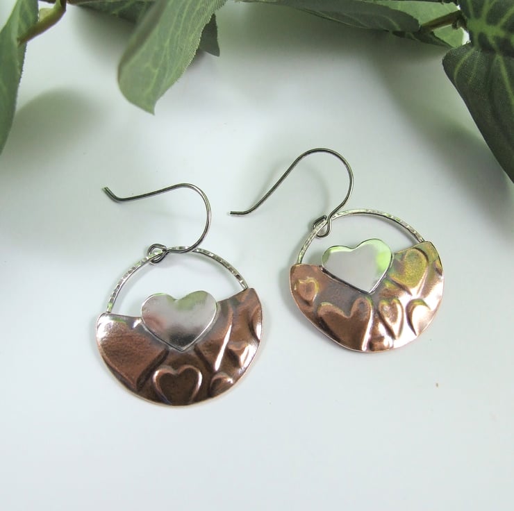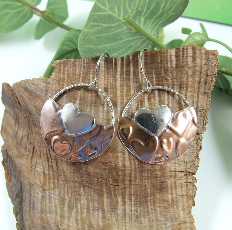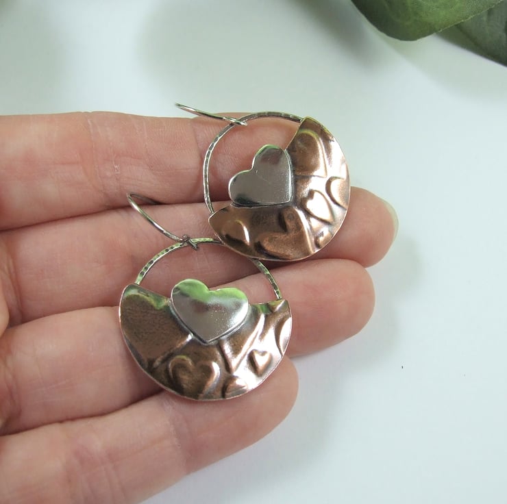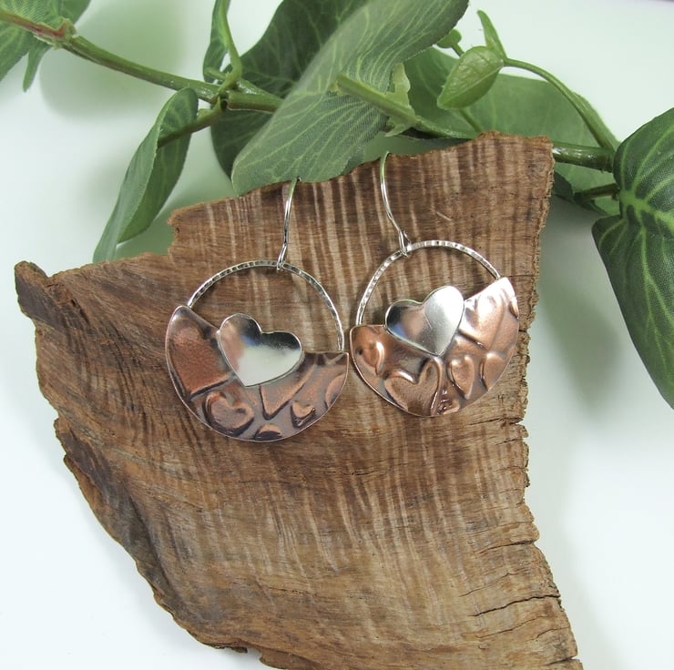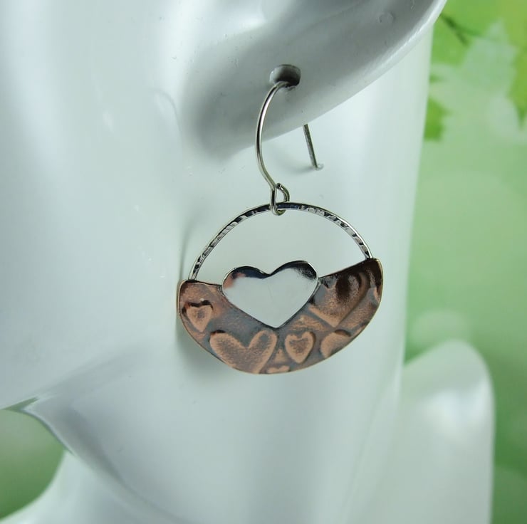 I have created the semi circle shapes from copper sheet, hand cut and textured with a hearts pattern. I then slightly domed the shapes and then soldered on a silver heart and a curved silver wire and added ear hooks. The earrings have been given an oxidised finish and polished.
