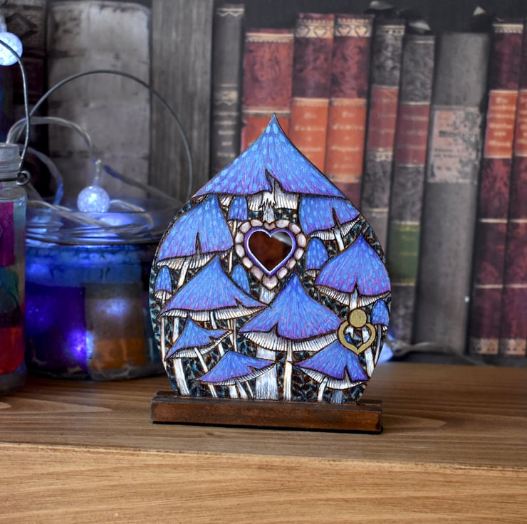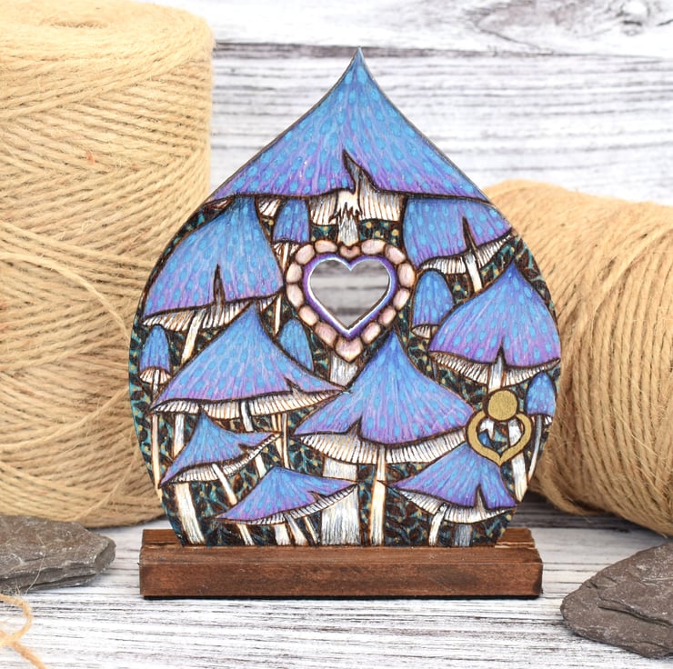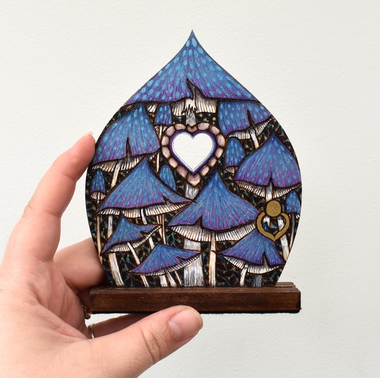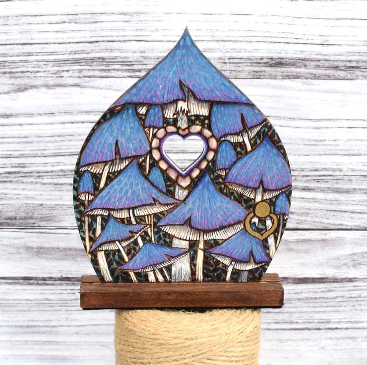 A free standing birch ply wooden fairy door with a purple toadstool design. Hand burned using pyrography and the coloured using stain and art pencils.
