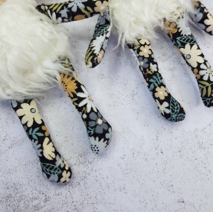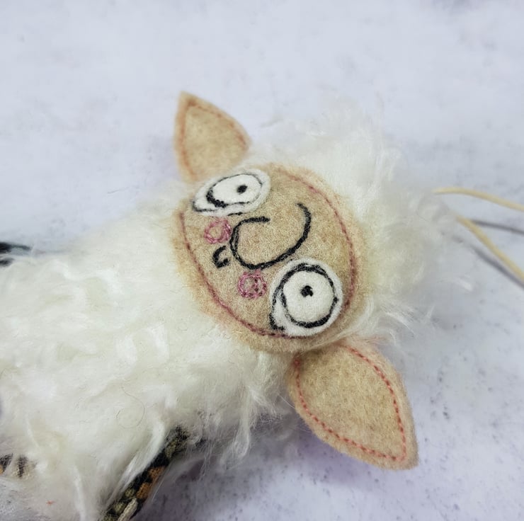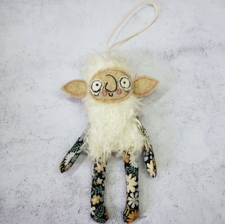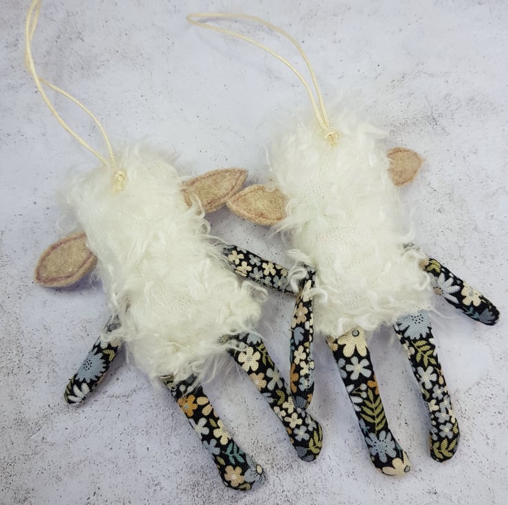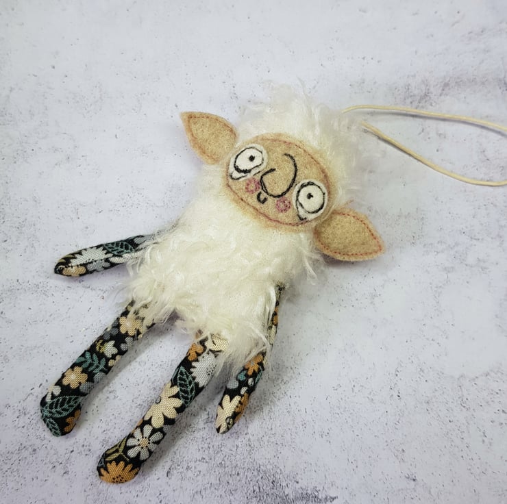 This listing is for one Sheeple. The sheeple have felt ears and faces with free motion embroidered details. They're bodies are made from soft and fluffy creamy white faux fur and there arms and legs have a beautiful ditsy floral pattern. They measure roughly 12cm tall and have waxed thread hangers attached. Sent in recyclable packaging. This is not a toy and meant for decorative purposes only. Your sheeple will be chosen at random from the two pictured.