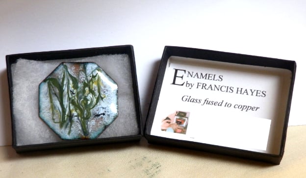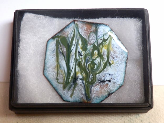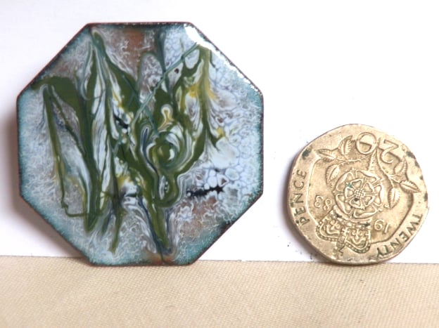 This brooch is based on a copper octagon on which I have built up several layers of clear enamel. I have then fired a layer of pale blue enamel over this base and after that, fired dark green rod with scatterings of white and dark pink enamel which I disturbed when red hot, to make the unique, random pattern.