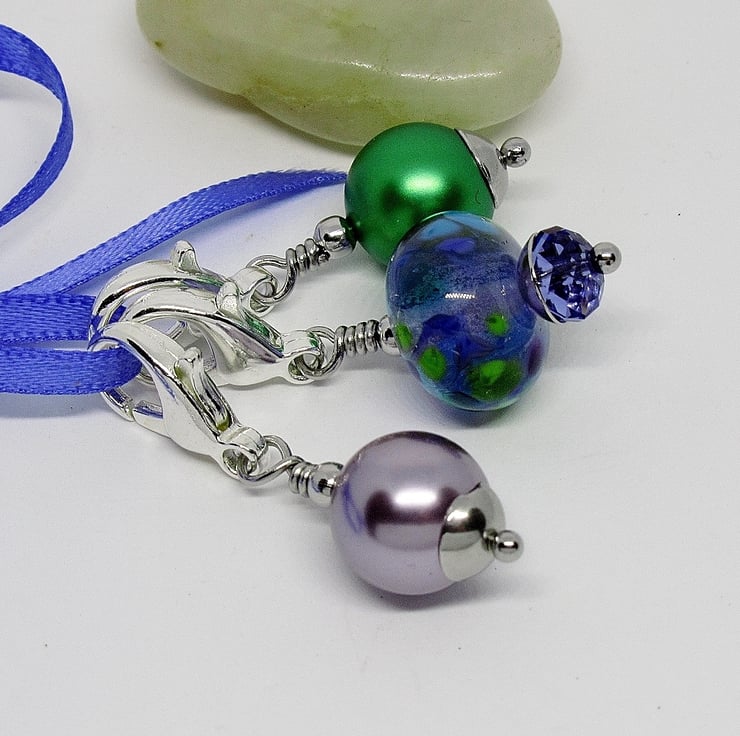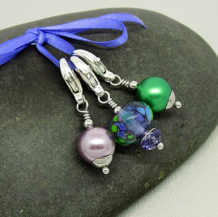 Purple and green set of three stitch markers featuring a gorgeous artisan made glass lampwork bead. This pretty lampwork bead is made from mauve glass with surface detail in purple and shades of green. It reminds me of moorland heather in particular Exmoor which I love. I have complimented the main bead with Swarovski pearls in mauve and green.