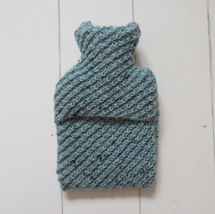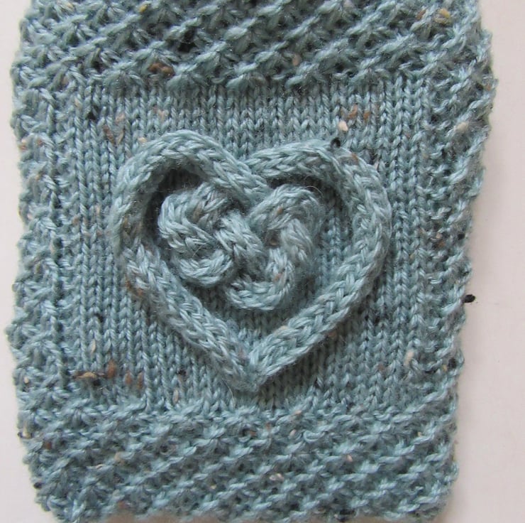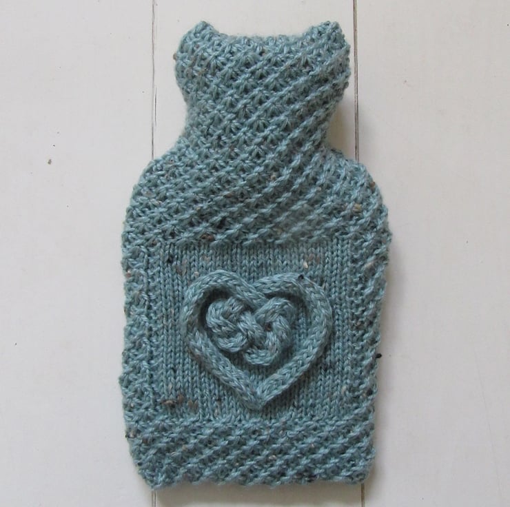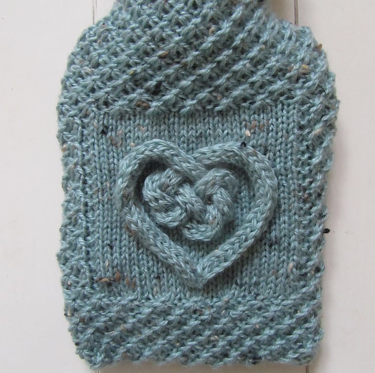 A hand knitted tweed hot water bottle cover in a duck egg blue coloured yarn, with coloured flecks in oat, caramel and chocolate brown throughout. The body of the hottie is knitted in a lace daisy stitch which lends a wonderful texture to the cover. There is a plain smooth square panel on the front onto which there is a raised 3D heart love knot, made in a chunky cord in the same duck egg blue tweed yarn. The cover fits snuggly around the bottle but with plenty of ease when filling is required. The back opens using an envelope style opening/closure.