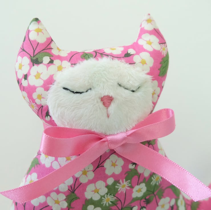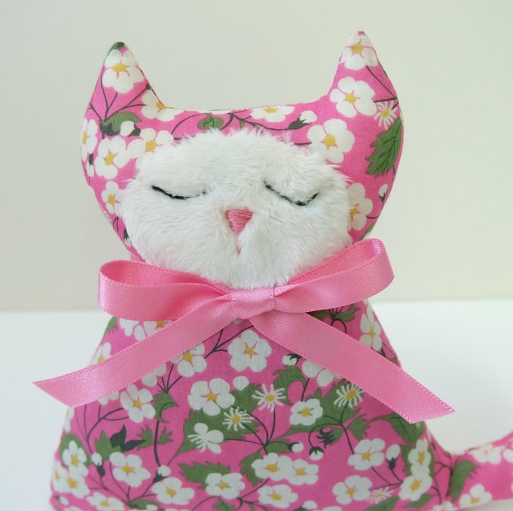The fabric is an organic cotton tana lawn floral fabric in a mid pink, green, golden yellow and soft white combination. The cat is filled with scoops of fresh organic lavender and toy stuffing for a firm shape. The scent lasts a long time and you only need to squeeze the cat to release the scent, or you can add lavender drops too. I've hand sewn a soft ivory plush fabric face and stitched eyes in black and a nose in pink embroidery thread, then added a pretty pink satin ribbon bow around the cat's neck.