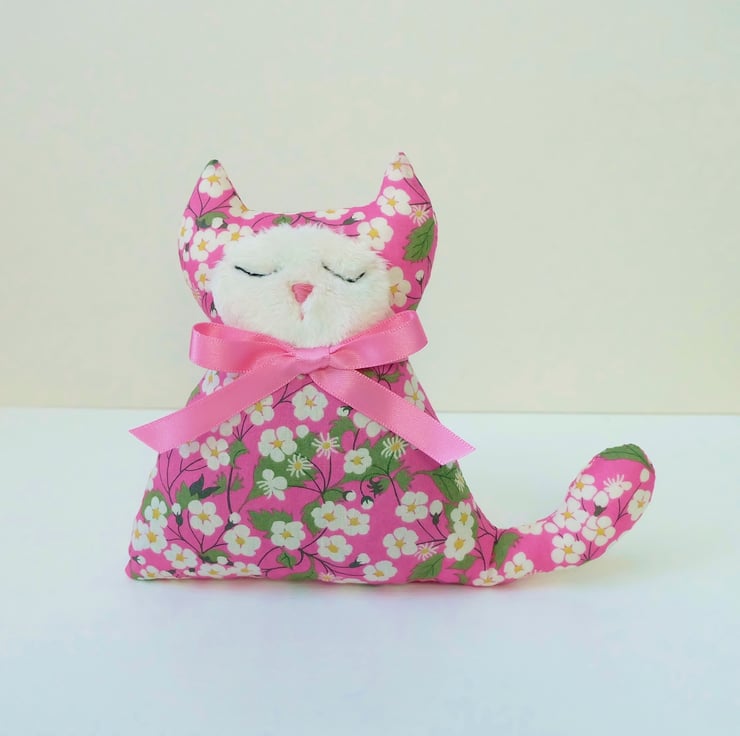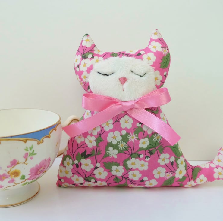 This lavender cat is made using lovely Liberty Mitsi fabric, in a special pink colourway. It makes an ideal pretty gift for a cat lover! Place the cat into bedroom drawers to sweetly scent clothes, or sit it on a pillow to aid a restful night's sleep.