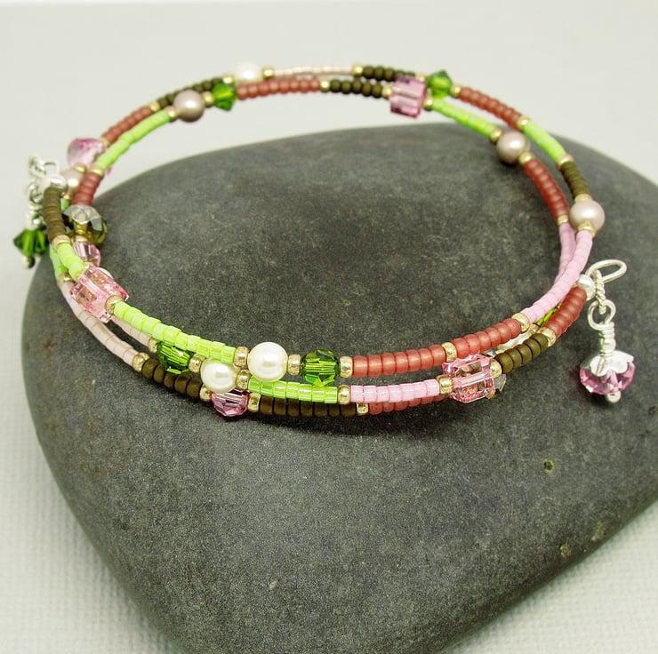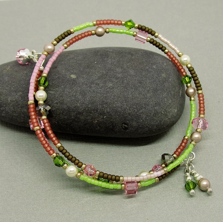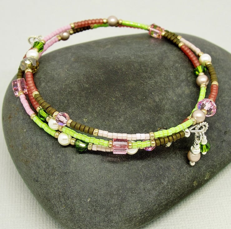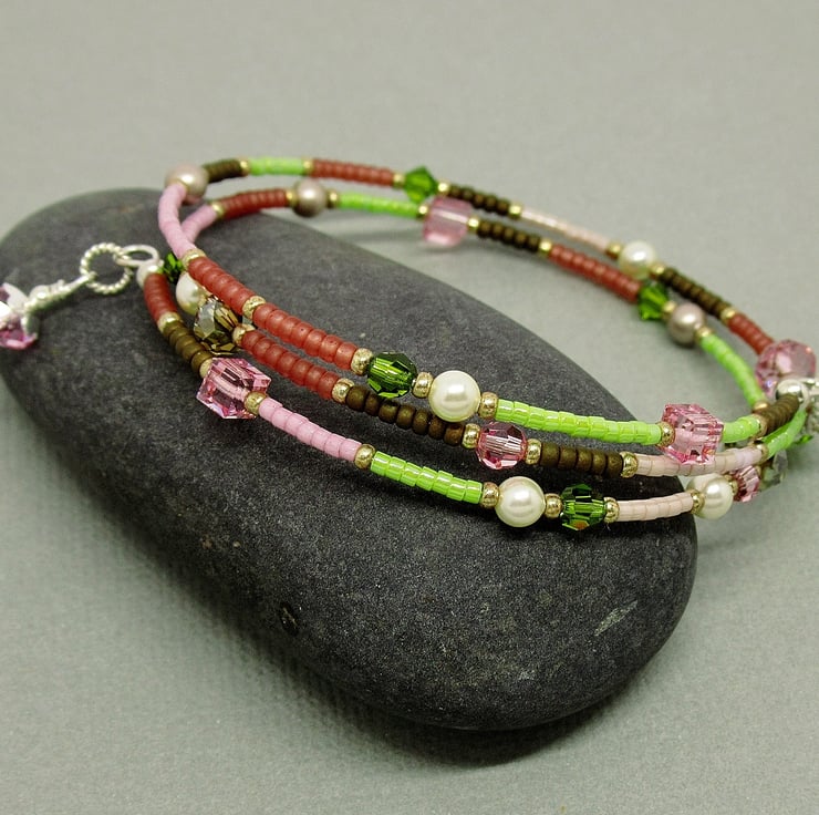 Glass bead bracelet featuring a beautiful collection of glass beads in muted shades of pink, terracotta, brown, green and ivory.