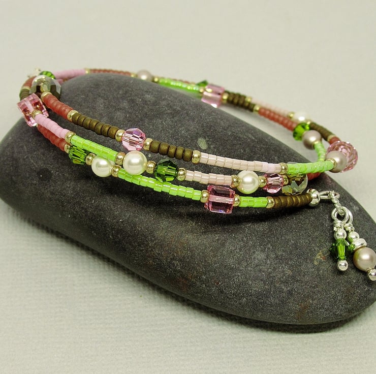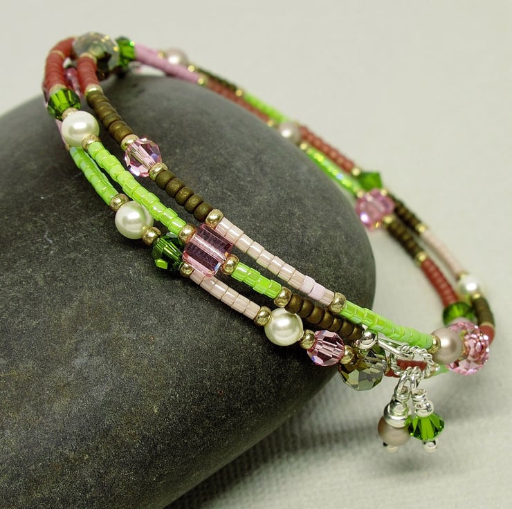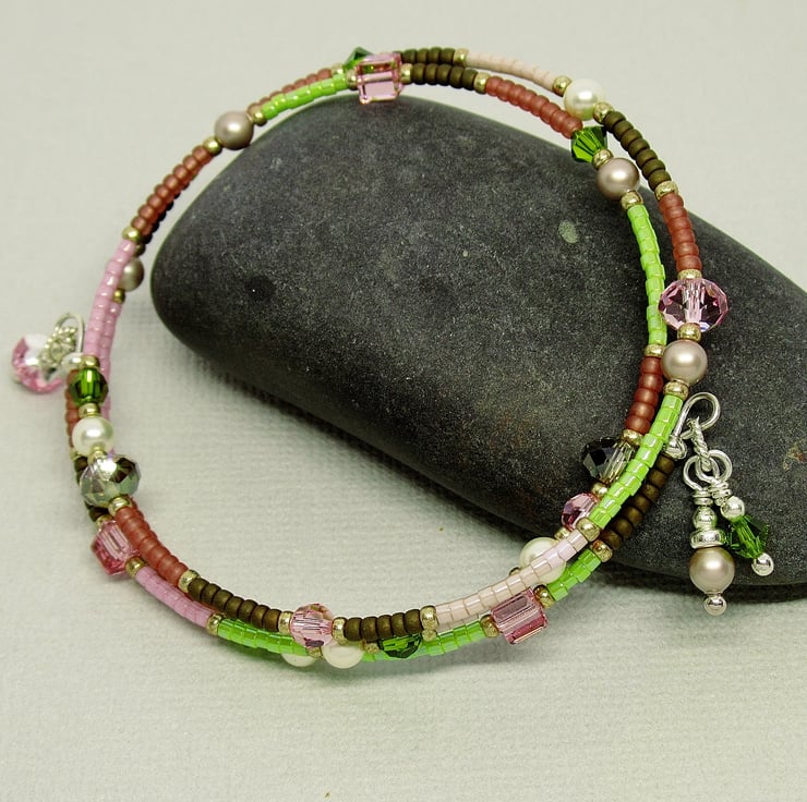 I have used Miyuki glass beads, Swarovski pearls and crystals in complimentary colours and has been finished with sterling silver beaded charms.