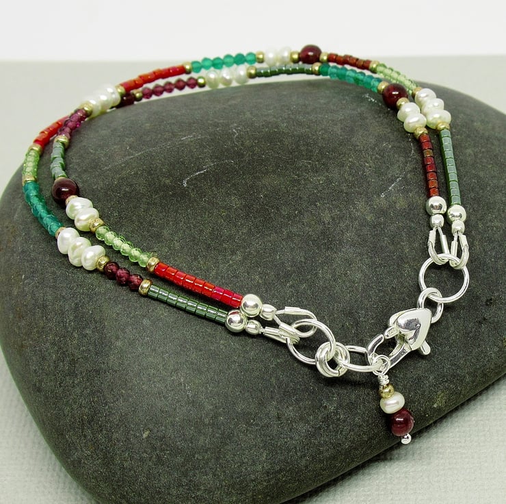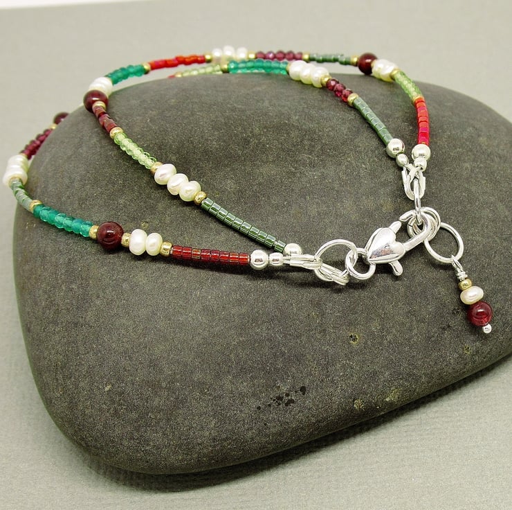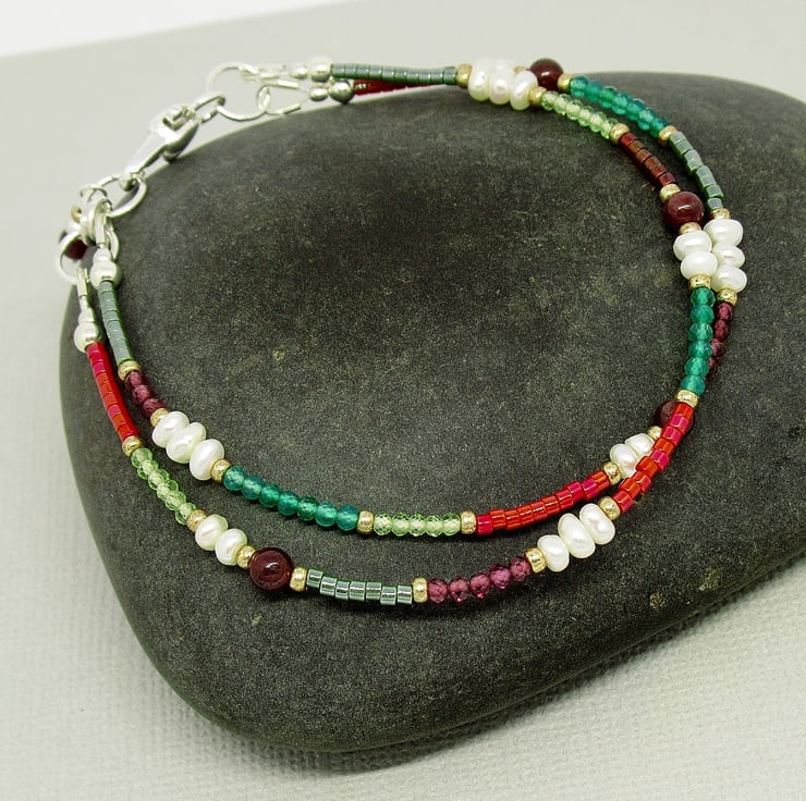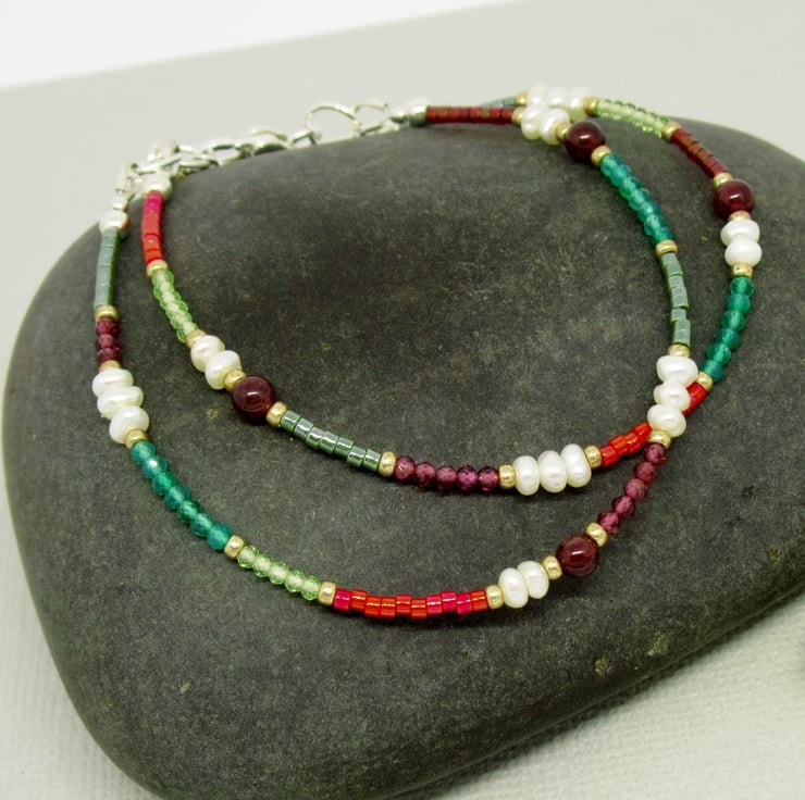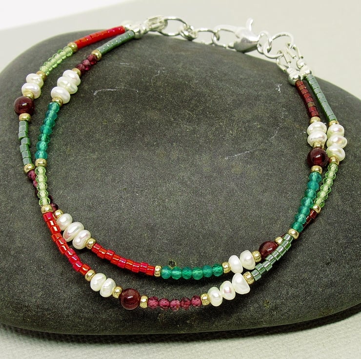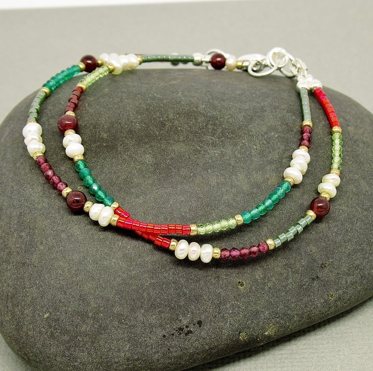 Red and green gemstone bracelet featuring a selections of tiny faceted Garnet, Green Onyx and Peridot gemstones. I have complimented these tiny but sparkling gemstones with ivory freshwater pearls and Miyuki seed beads with a hint of gold.
