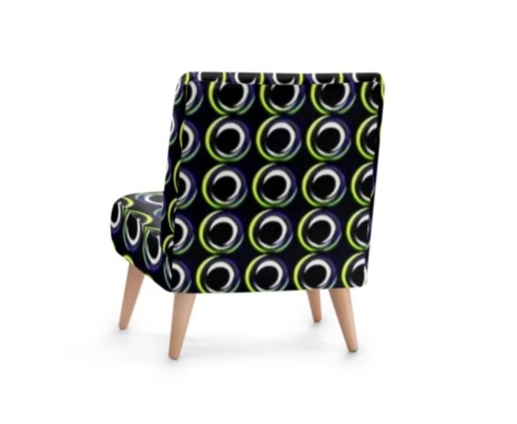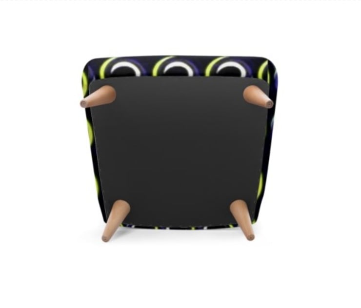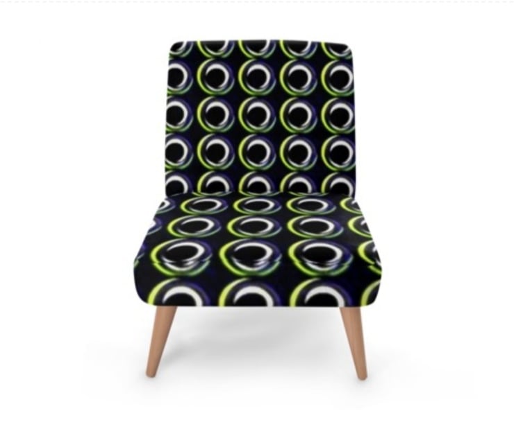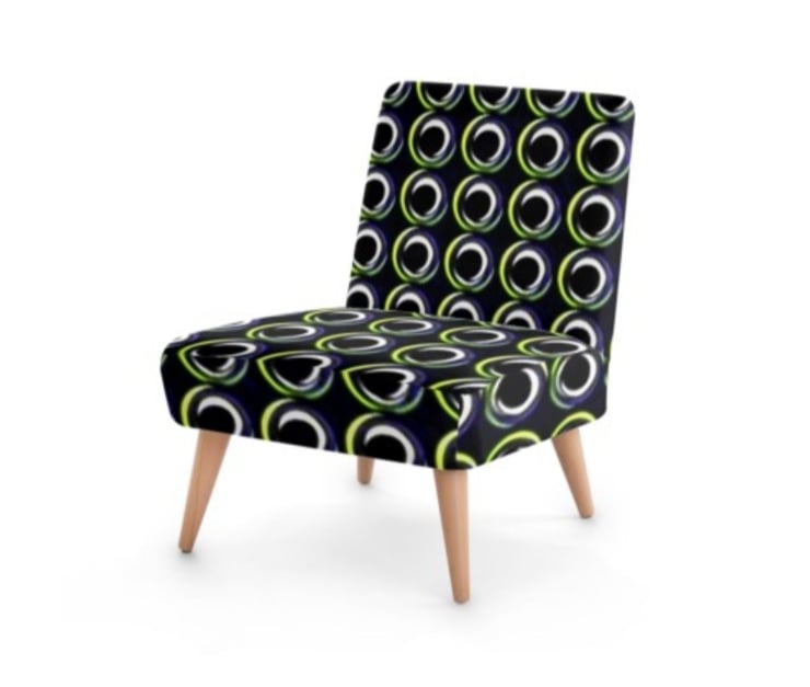 THE CHAIR IS A NATURAL TRANSITION FROM THE PAINTING.THE DESIGN WAS ORIGINALLY AN ACRYLIC ON CANVAS PAINTING.I HAVE TRSNSFERRED THE IMAGE ONTO THE VELOUR FABRIC AND CREATED A BEAUTIFUL OCCASIONAL CHAIR WHICH HAS BEEN RESPONSIBLY SOURCED FROM BEECH WOOD,
