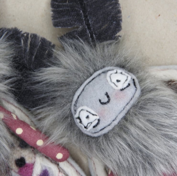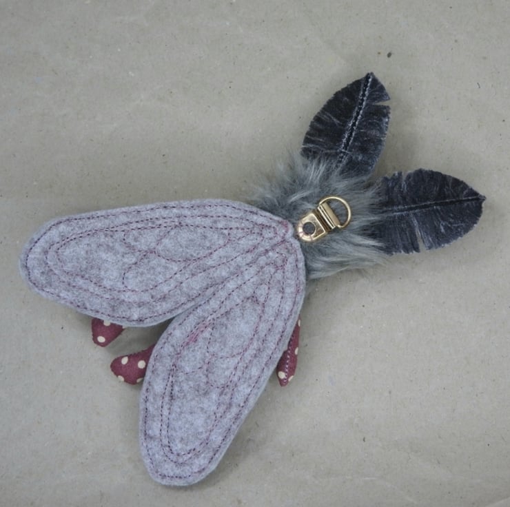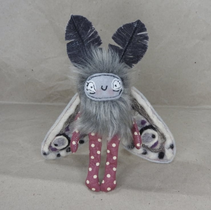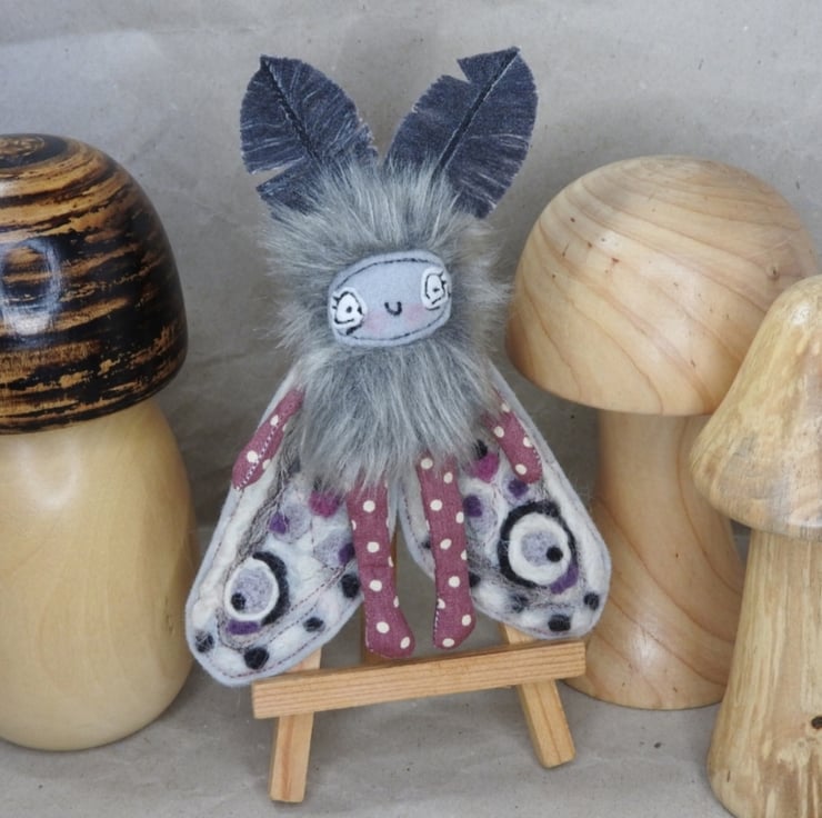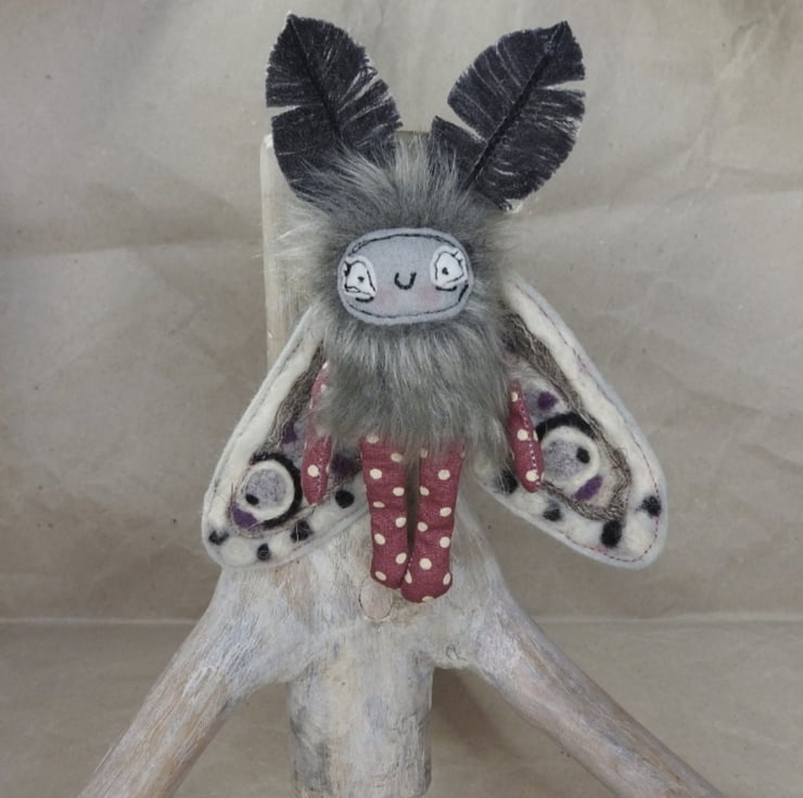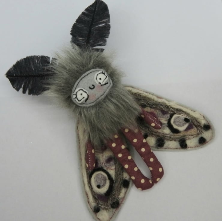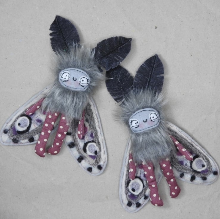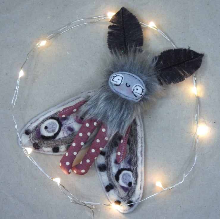 These magical mothlings have soft faux fur bodies with free motion embroidered felt faces. Their antennae are stiffened cotton and their wings are needle felted, hand dyed wool on felt. They all come with metal hangers attached, perfect for wall hanging. Waxed thread hangers will also be sent so that they can be hung and if you push their wings behind them they can sit unaided. Although all mothlings are made from the same pattern they all vary slightly. This listing is for one mothling. These are made for decorative purposes only and are not a toy. Sent in recyclable packaging. Mothlings measure roughly 14cm tall and 12cm wide.