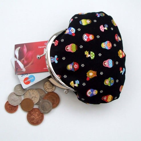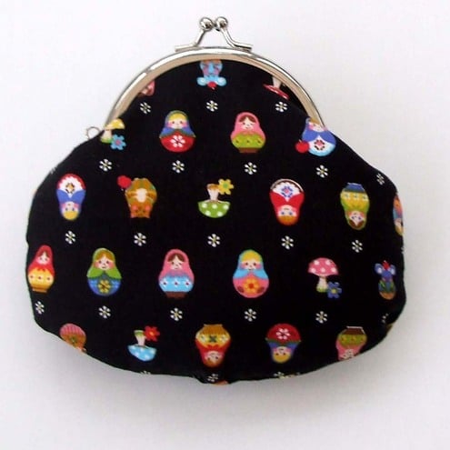 Perfect little purse for your keys, change and credit cards.Little Russian dolls fabric with contrasting lining, padding and metal frame clasp.