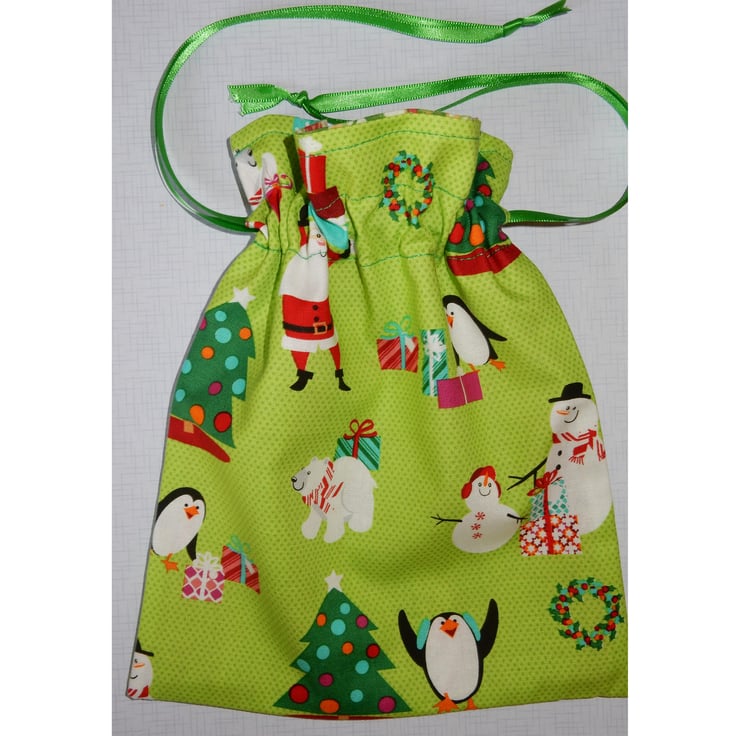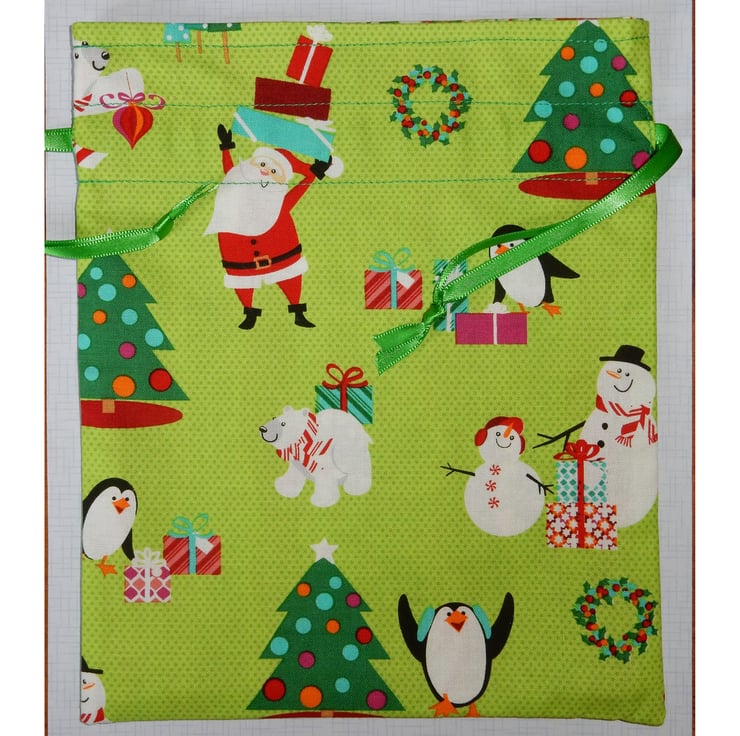 This is a really fun re-usable fabric gift bag which measures 9 x 7.5 inches. It is fully lined in holly print fabric. There is a drawstring closure with green satin ribbon, which can be used to hang it and will keep the contents safe. This is made from a festive print fabric featuring penguins, snowmen, Christmas trees, polar bears and Father Christmas.